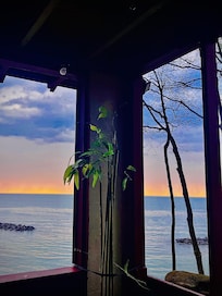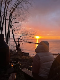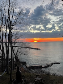 The house is situated on top of the bluffs overlooking Lake Ontario. There is a patio area right outside of the deck where you can sit out and enjoy the sunsets way above the lake. A lower level has much more space to relax and sit around the fireplace. As you make your way down to the water, you will see the beautiful rock beach with crystal clear waters which you can enjoy. Have fun looking at the assortment of unique rocks, and you may even find some sea glass!