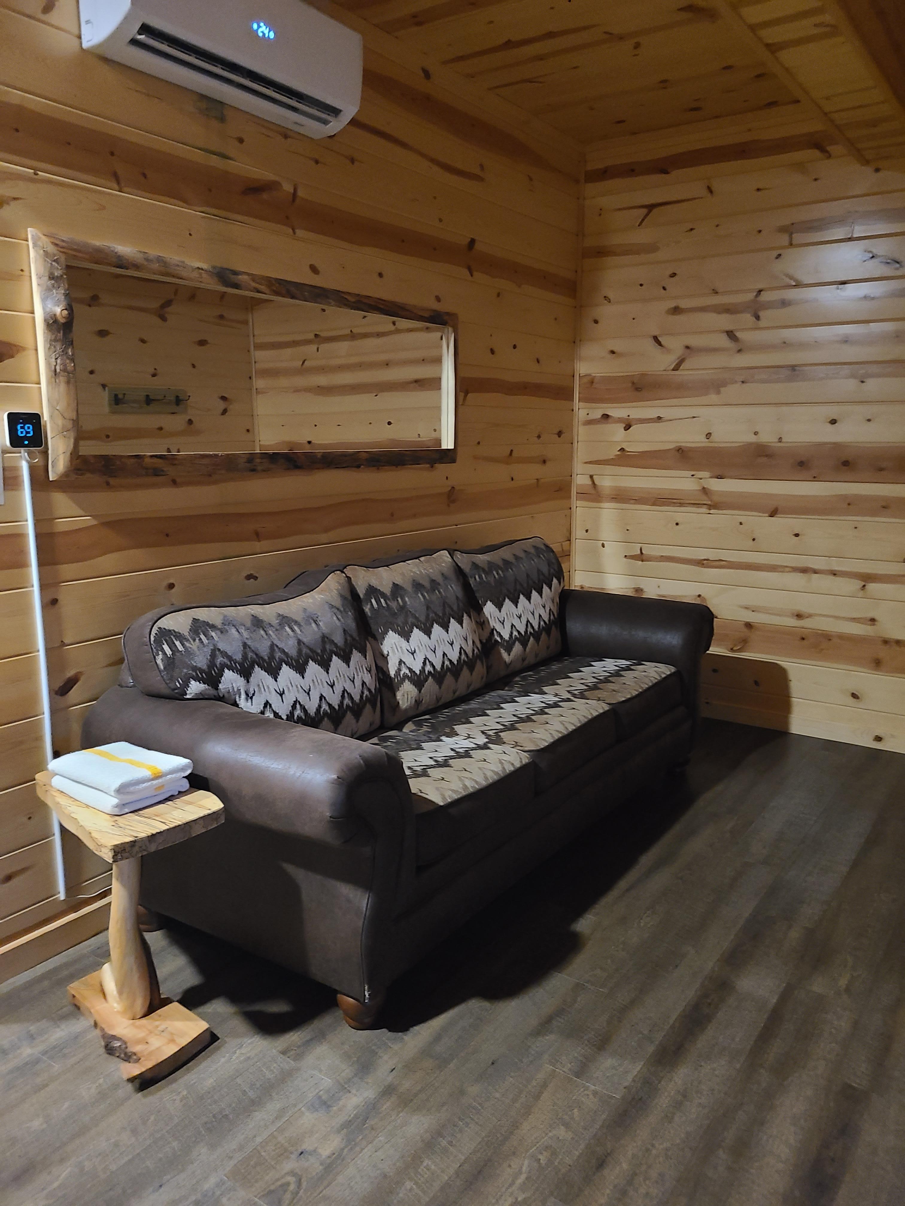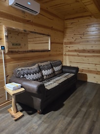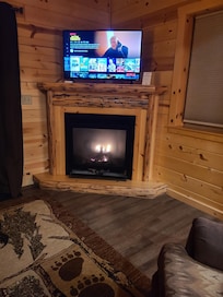 The comfortable living area boasts a large gas fireplace next to the cozy sofa and recliner which make for good spots to nap by the fire, read a good book, or watch the 42-inch Roku Smart TV.