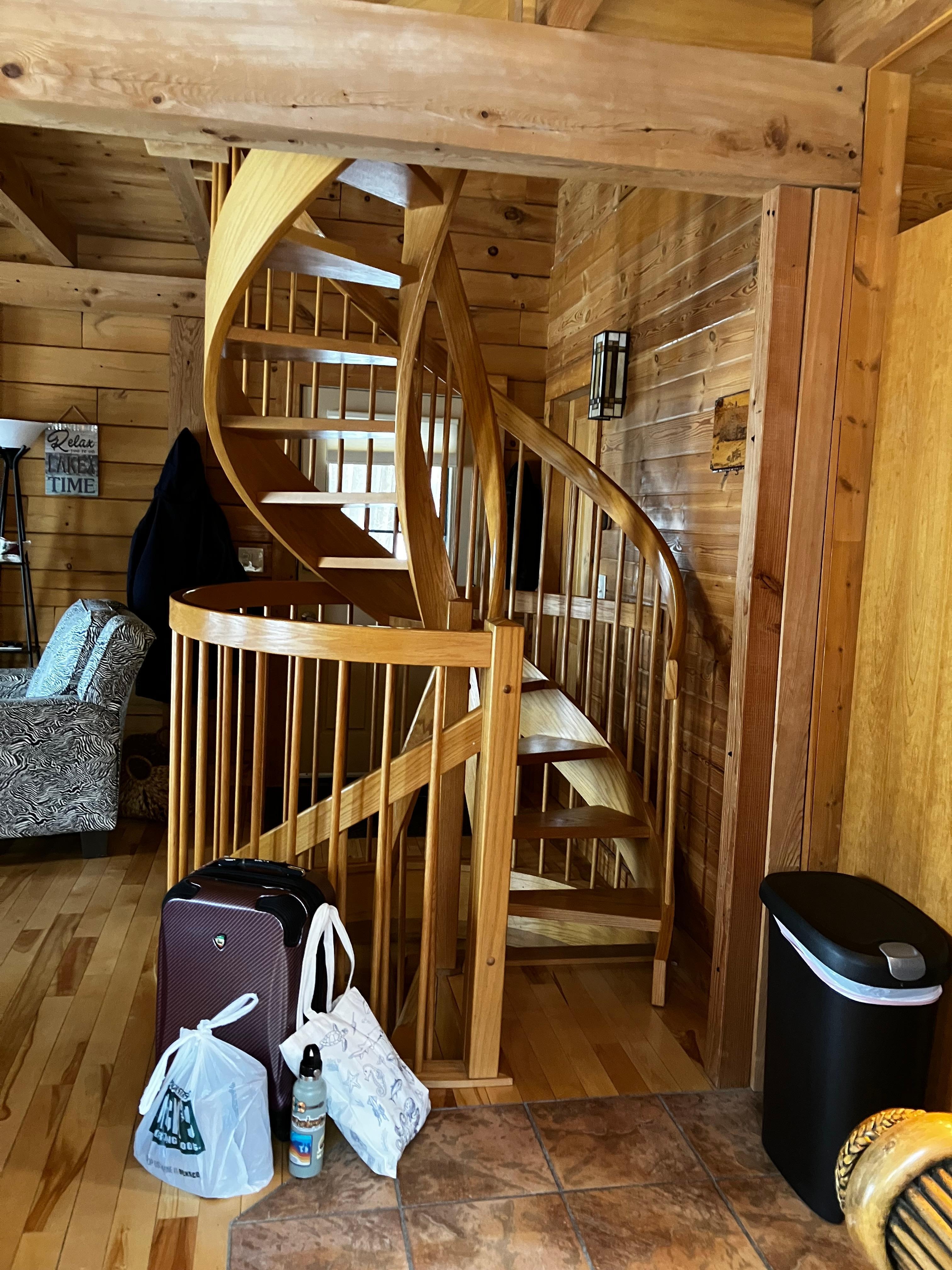 This fully- furnished modern two bedroom cabin sleeps six with three floors connected by a spiral stairwell. Towels and linens provided. The main floor’s living and dining room looks out across the lawn to the lake with a deck for grilling and outdoor dining. The kitchen has modern appliances including a dishwasher and both drip and pod coffee makers. The water is well-supplied and potable. The main floor bathroom has a toilet, shower and houses the washer and dryer. The upstairs bedroom offers a stunning view of the lake with queen, single and trundle beds, half bath and walk in closet. The downstairs bedroom has a queen, work/desk space, a walk-in closet and direct access to the lakeside yard. The cabin operates on a septic system and has radiant heat in the floors and an AC/heat pump in the upstairs loft. Wifi is available, and the TVs on each level offer on-demand streaming services.