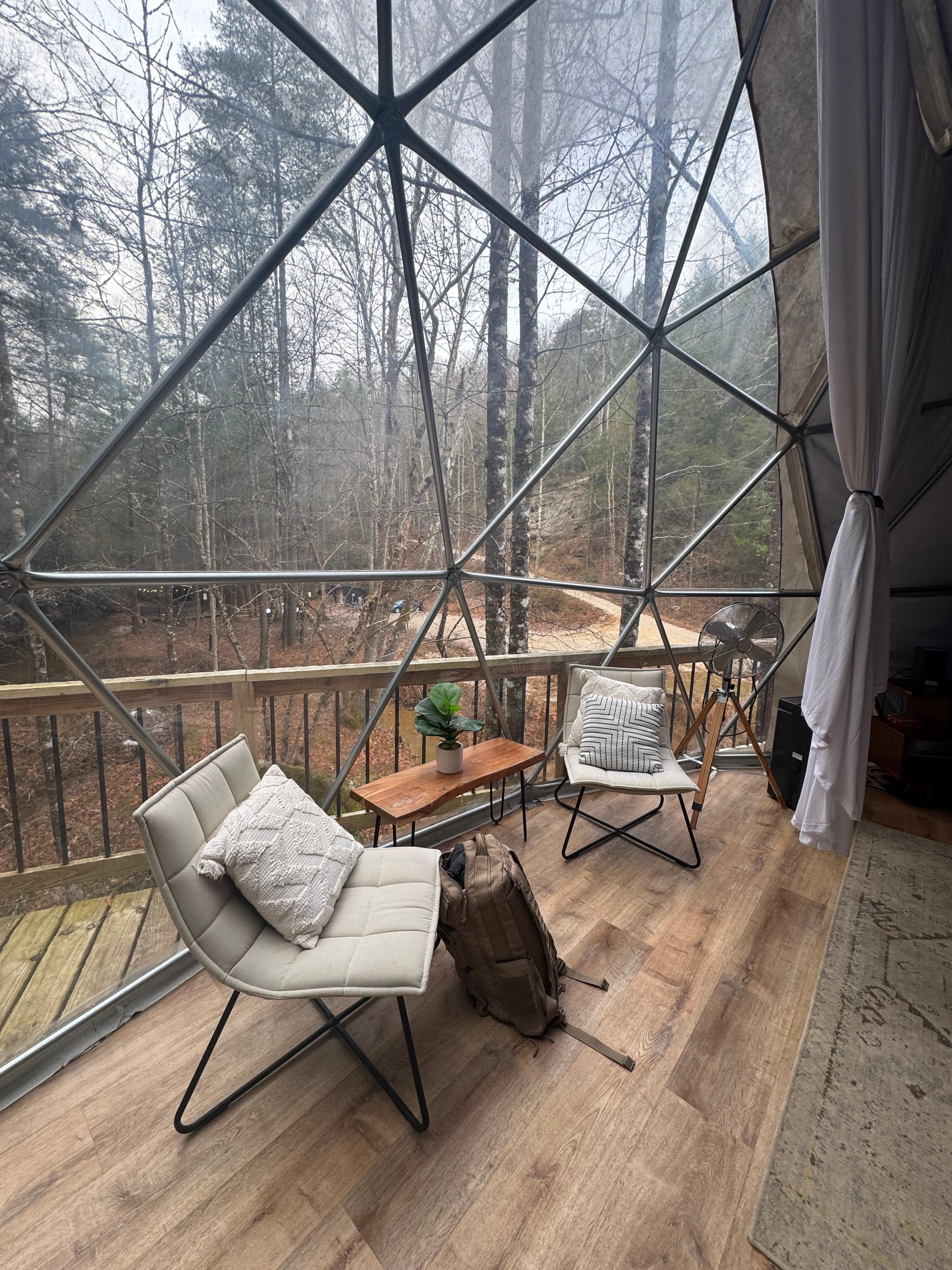Our property is located on a 40ft. wide deck structure, lofted 2 stories in the air! The structure is a geodesic dome, wrapped in heavy duty exterior vinyl, but finished on the inside with cozy cabin furnishings. The space has running water from our well, electricity, HVAC, a full-bathroom, and 3 beds that can accommodate up to 6 guests... plus a hottub :)