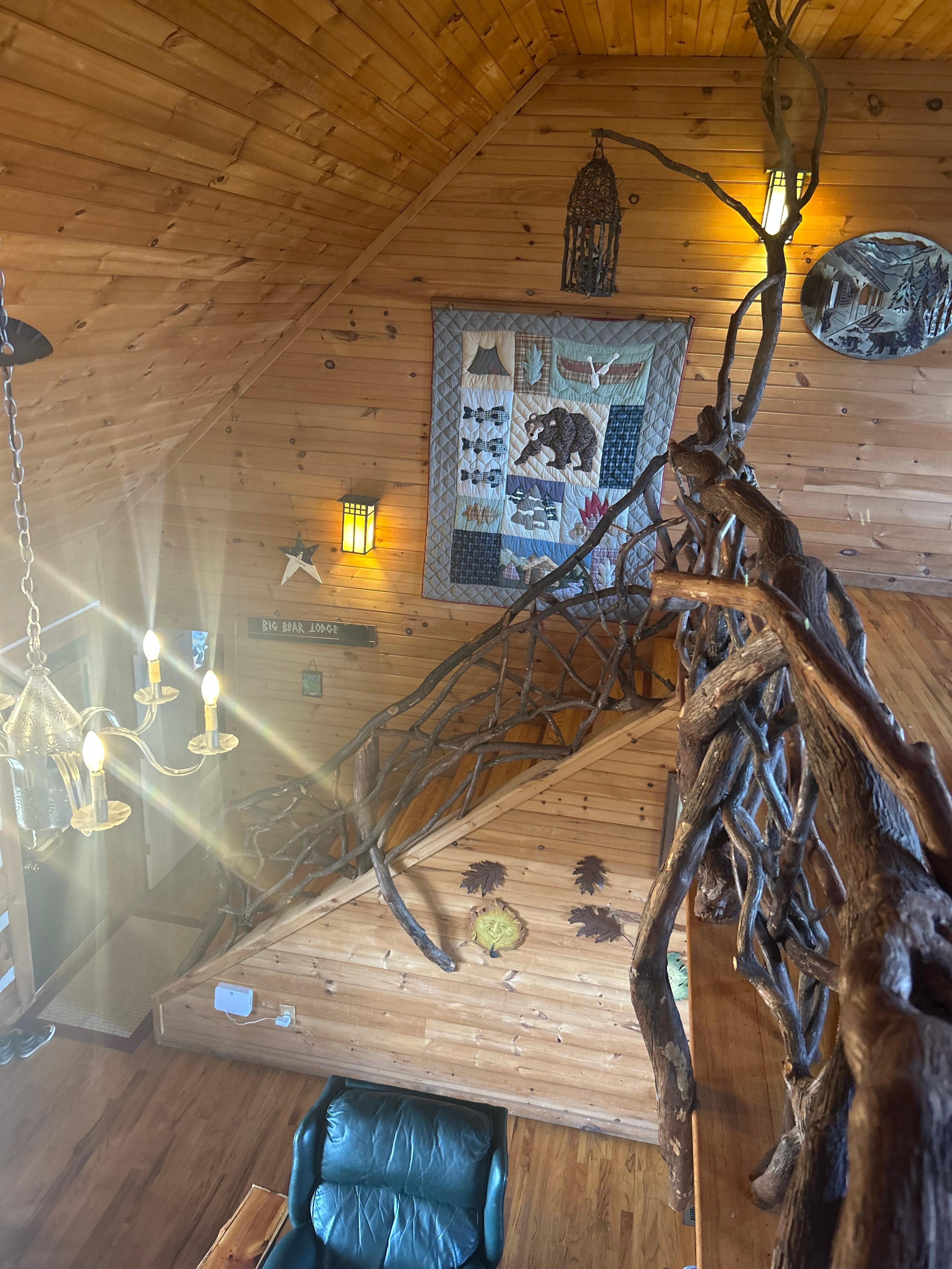 Enjoy the open floor plan of this cabin while you relax during your mountain retreat. The unforgettable twig style banister and railing on the staircase and loft will definitely make a lasting impression, and the long range mountain view will take your breath away.