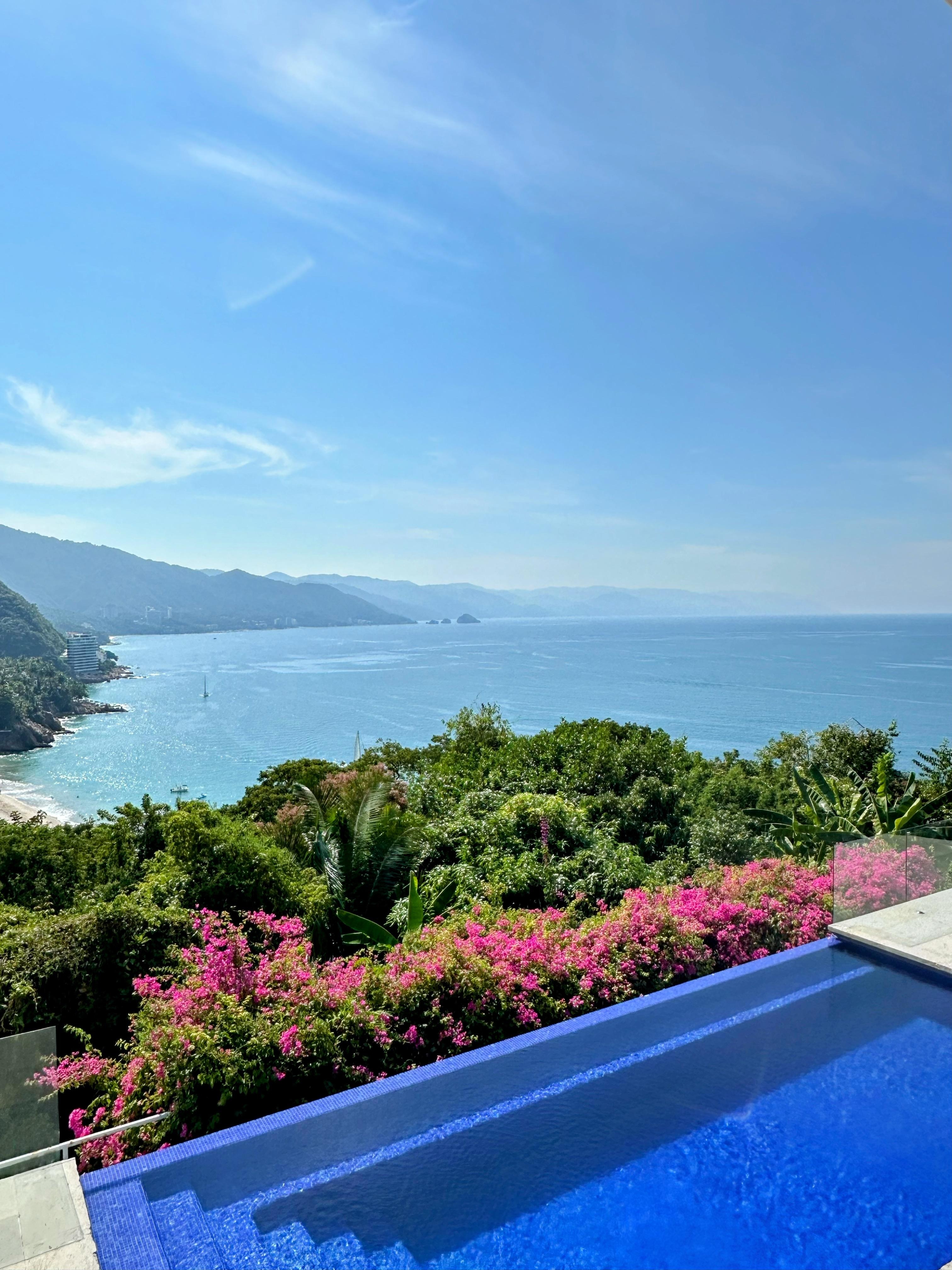Villa Ensueno Tropical es una villa privada ubicada en una tranquila calle sin salida en el exclusivo barrio de Conchas Chinas a lo largo de la costa sur de Puerto Vallarta. La villa está ubicada en un montículo con vista a la bahía de Banderas, color aguamarina, y está rodeada de exuberante follaje, plataneros y otra vegetación tropical ... totalmente privada. Las impresionantes vistas se extienden por millas y millas. Desde mediados de diciembre hasta principios de abril, es posible que vea a una madre ballena jorobada enseñándole a su cría a respirar. Disfrute de la tranquilidad de Villa Ensueno y, sin embargo, esté a solo unos minutos a pie de la playa y a 5 minutos en automóvil de la Zona Romántica, la mejor parte de la ciudad.