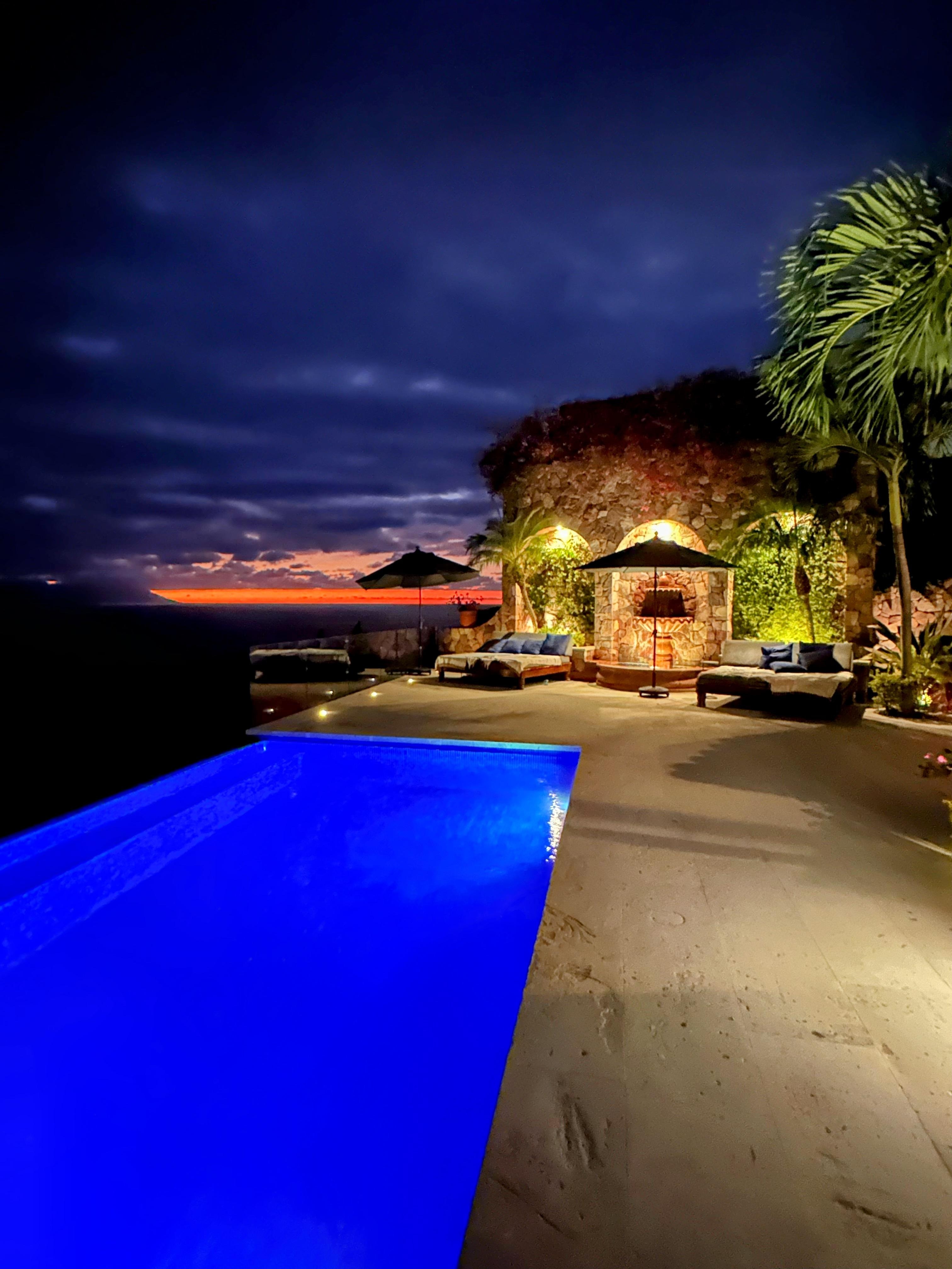 La terraza de baldosas más baja de la Casa Sueño cuenta con una piscina infinita climatizada con vista al sudoeste para sumergir los sentidos en las tranquilas aguas de la bahía y los impresionantes atardeceres tropicales. La posición de la propiedad proporciona total privacidad, aislamiento total. Ofrecemos toallas de playa de lujo.