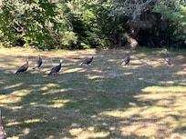 We love the land which is approximately 2.6 acres. The open, grassy area is big and level but the perimeter of the property is surrounded by big beautiful evergreens! There are many other varieties as well so the land is interesting during the fall season. The location is peaceful and quiet yet the property is not very far from anywhere on the Island. The wildlife is plentiful-you might see several deer just a few feet from the windows and the wild turkeys and other birds are all around. We have had rabbits, chipmunks, squirrels, ducks and even a bear was spotted while eating a neighbor's bird seed last year!