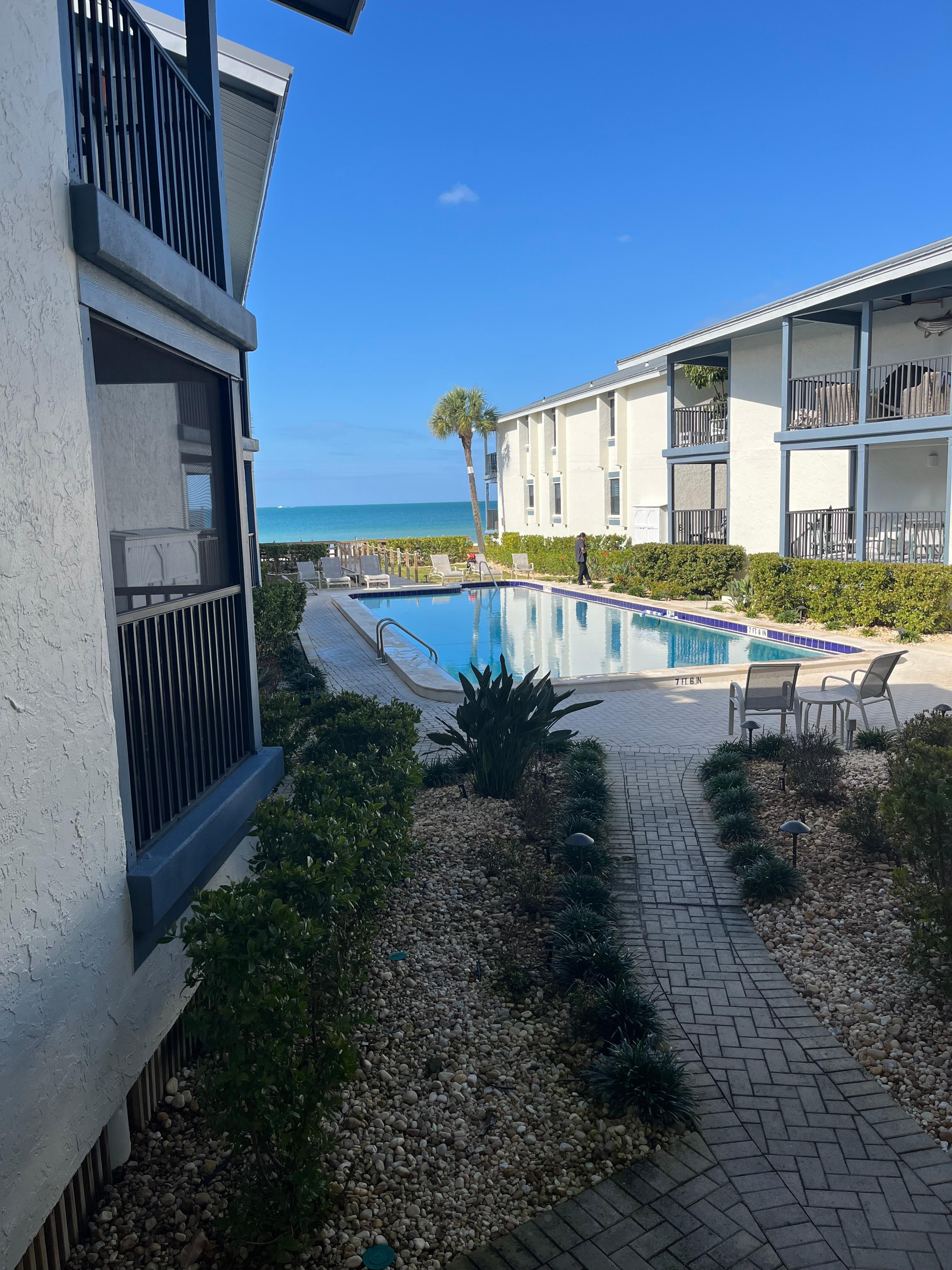 Our spacious end unit was completely updated at the beginning of 2024 to provide all the modern comforts in a relaxed beach atmosphere. There are views of the Gulf from the spacious living room and private balcony. Our unit’s balcony is ideally located in the most shaded and breezy location of the entire complex. Enjoy views of the Gulf over the heated pool in shaded comfort, or take a stroll down the stairs from your porch to the pool and private deck overlooking the beautiful turquoise waters of Florida’s Gulf Coast. From the private deck, you can access the white, sugary beaches of Anna Maria Island, where you can walk for miles, take a swim, look for dolphins, or search for seashells. If your timing is right, you may even see a nesting or hatching sea turtle.