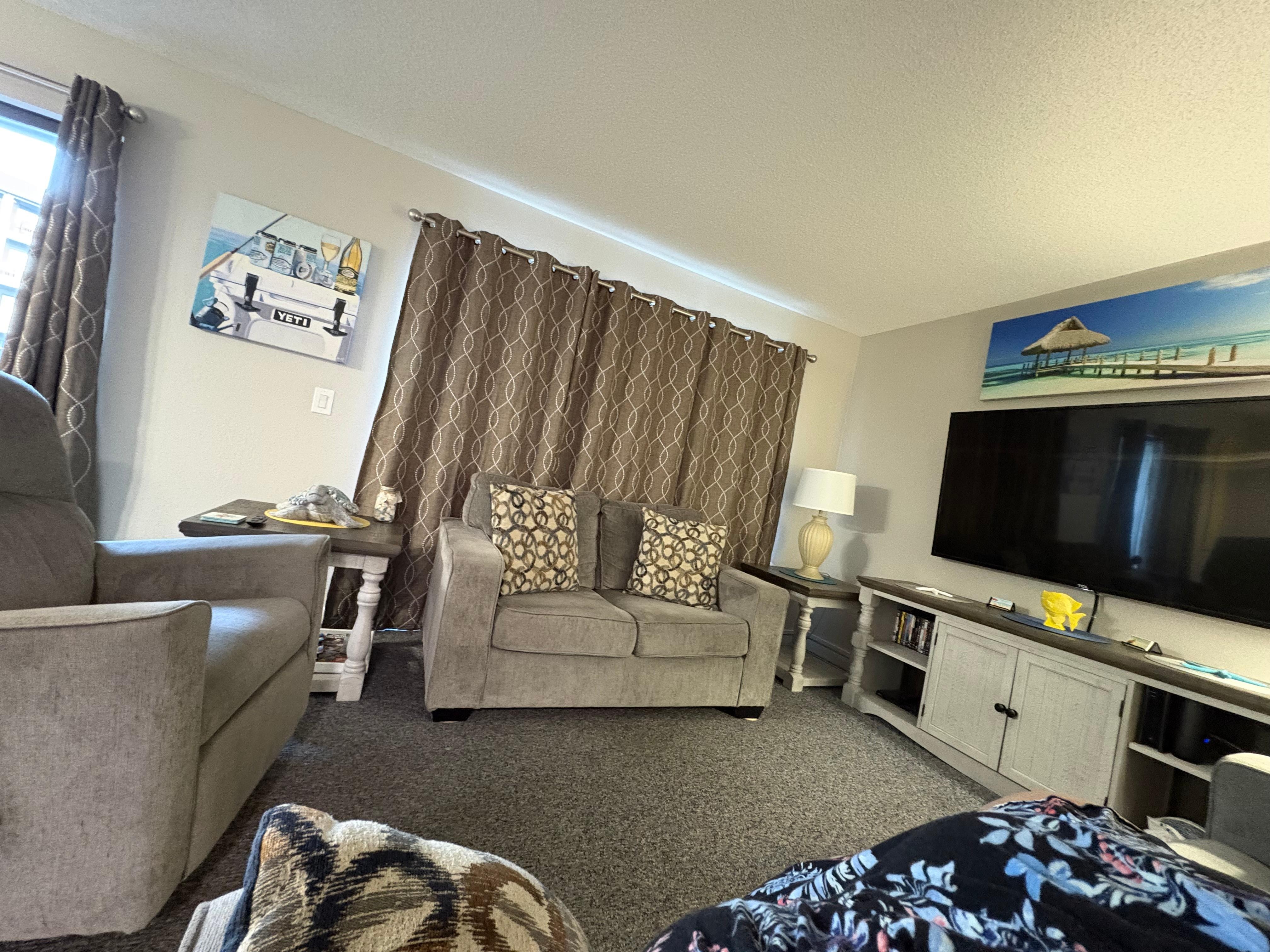The new balcony seating gives you a great view of the morning sun over the beach while sipping your morning brew. With sliding door access, you can head straight into the best stocked kitchen to whip up a meal or into the living room to curl up with a book. This kitchen is fully stocked with everything you can imagine from complete cookware to cooking spices and amenities not typically provided in other rentals. You’re invited to pass around homemade dishes at the lovely dining table with seating for 6. If the chef’s not in the mood to cook, you could chow down on burgers at the Quarterdeck or order delivery.