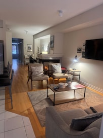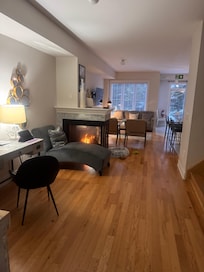 Our spacious and tastefully decorated living room features a cozy fireplace, perfect for warming up after a long day on the mountain and enjoying some apres-ski. Need to catch up on some work during your stay? We have wifi and a dedicated workspace for you to stay productive.