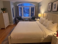 The open concept kitchen is complete with servingware, cutlery, cookware and small appliances. Pull up a chair at the kitchen island, sip coffee and talk about your day. The large dining table comfortably seats 8–ideal to gather round for a big meal. A Keurig coffee maker is available, just bring your own coffee pods!