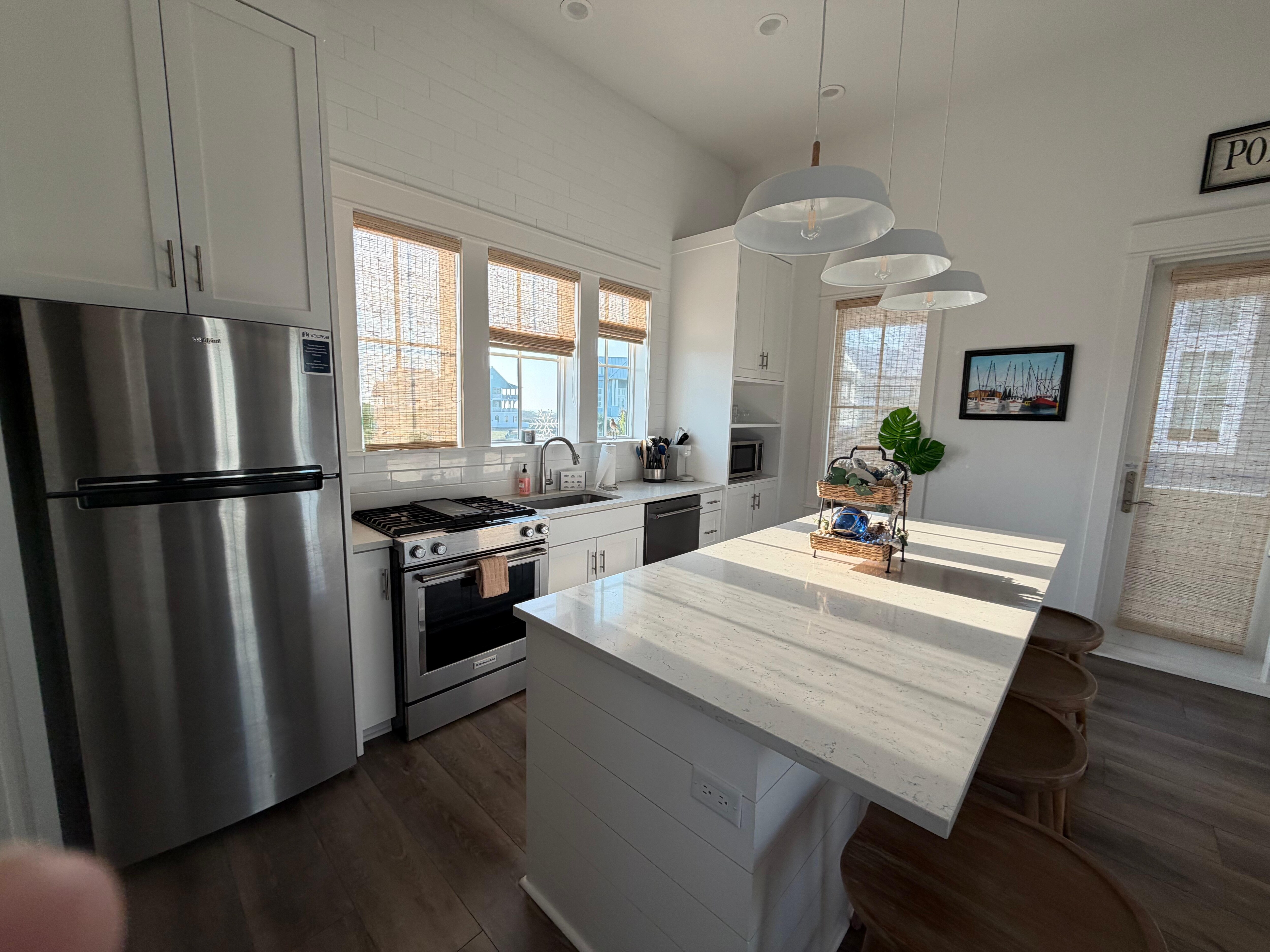 Within the inviting interior of your sweet retreat, discover dazzling beach-chic decor, updated appliances, and ample natural lighting. Lounging will come easy in the spacious living room where plush seating and a large TV await your enjoyment. The well-equipped kitchen gleams with its stainless steel appliances and ample counter space. Whether you're eating takeout or a home-cooked meal, dine inside at the in-kitchen dining table or eat alfresco on the home's spacious balcony.