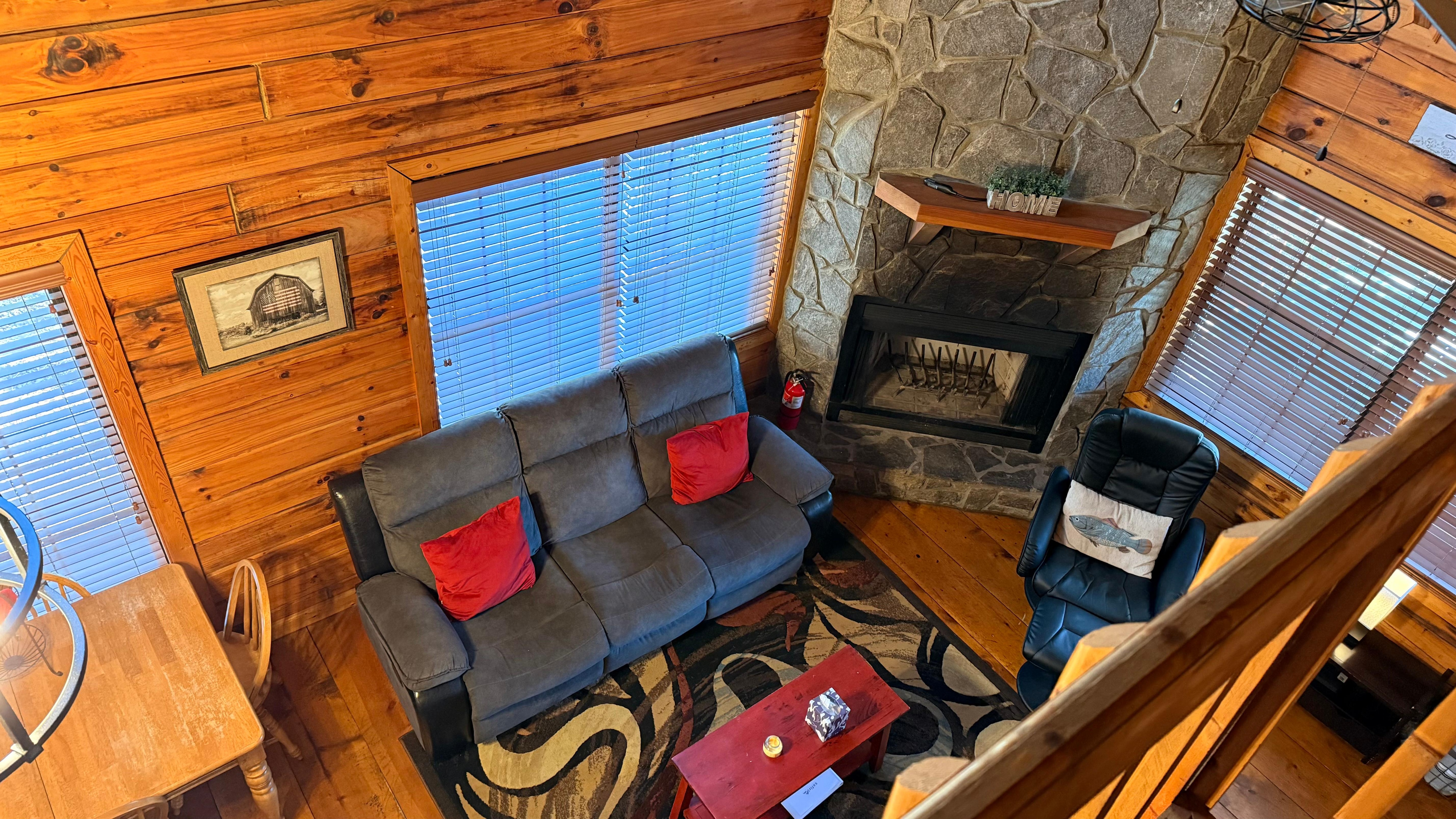 The fully equipped kitchen boasts stainless steel appliances and a gas stove, perfect for whipping delicious meals. You'll love the new granite countertops and light fixtures. The cabin also has an indoor fireplace that offers the perfect way to spend a relaxing evening, with its crackling flames and ambient warmth creating a cozy ambiance that's hard to resist.