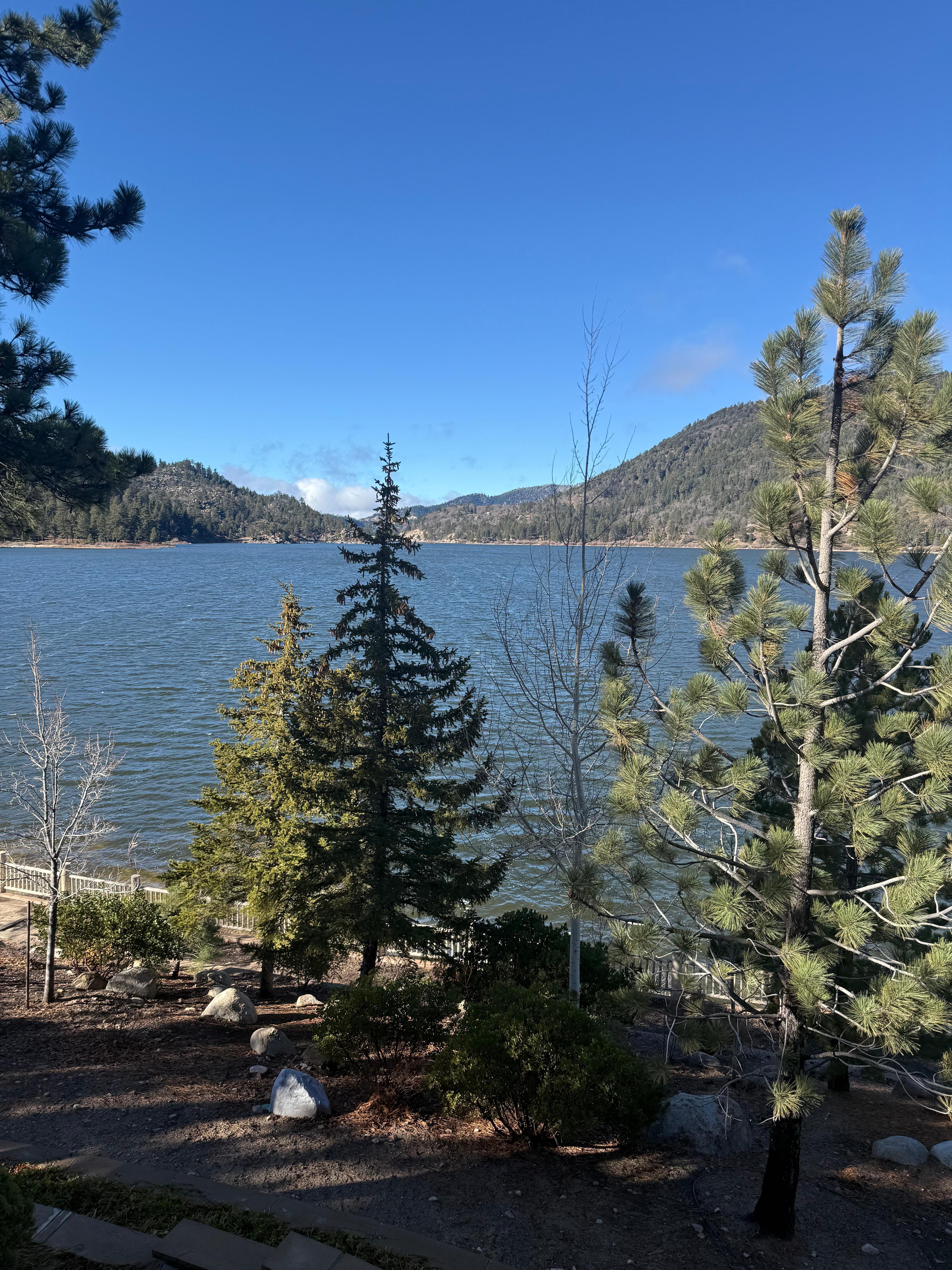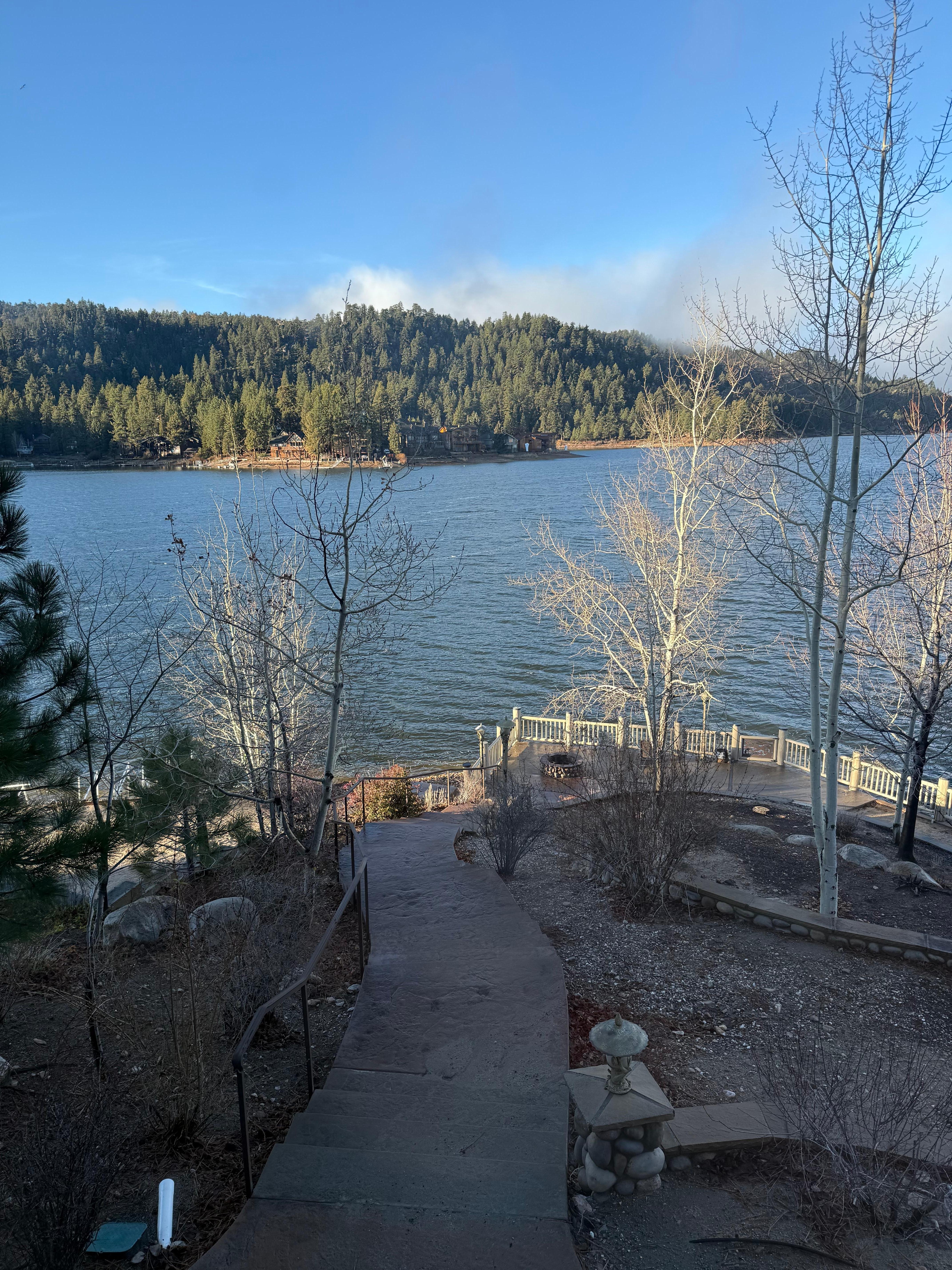 Esta casa bellamente decorada con sus espectaculares vistas es diferente a cualquier otra en Big Bear Lake. Ubicado en una tranquila calle sin salida en el Punto de inspiración en los confines de Boulder Bay, las vistas son impresionantes desde todas las direcciones. Espere una experiencia 'exagerada' cuando se aloje en esta casa. El espacio vital único ofrece una sensación de cabina acogedora y cómoda. Los hermosos troncos pelados a mano redondos, los pisos de madera, las encimeras de granito y los cómodos muebles ofrecen una verdadera experiencia hogareña en la montaña. El patio al aire libre con chimenea es donde probablemente pasarás gran parte de tu tiempo disfrutando de la vista y relajándote mientras escuchas los sonidos de la montaña junto a un fuego crepitante. El patio inferior es un lugar perfecto para relajarse en una silla Adirondack con los pies en alto mientras observa pasar los botes turísticos 'Barco pirata' o 'Big Bear Queen': ¡tenga su cámara lista! Si eres un adorador del sol, disfrutarás del tercer patio junto al lago, o mejor aún, ve y camina hacia el muelle para estar aún más cerca de toda la acción del lago: pesca, paseos en bote, embarque, tubos, kayak y nadando. Al acercarse la noche, tenga su cámara lista nuevamente porque verá algunas de las puestas de sol más bellas de la historia.