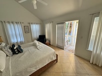 Upstairs features a calm color scheme and comfortable bed linens. Master suite offers a king size bed, private bath, flat screen TV and a romantic private balcony.