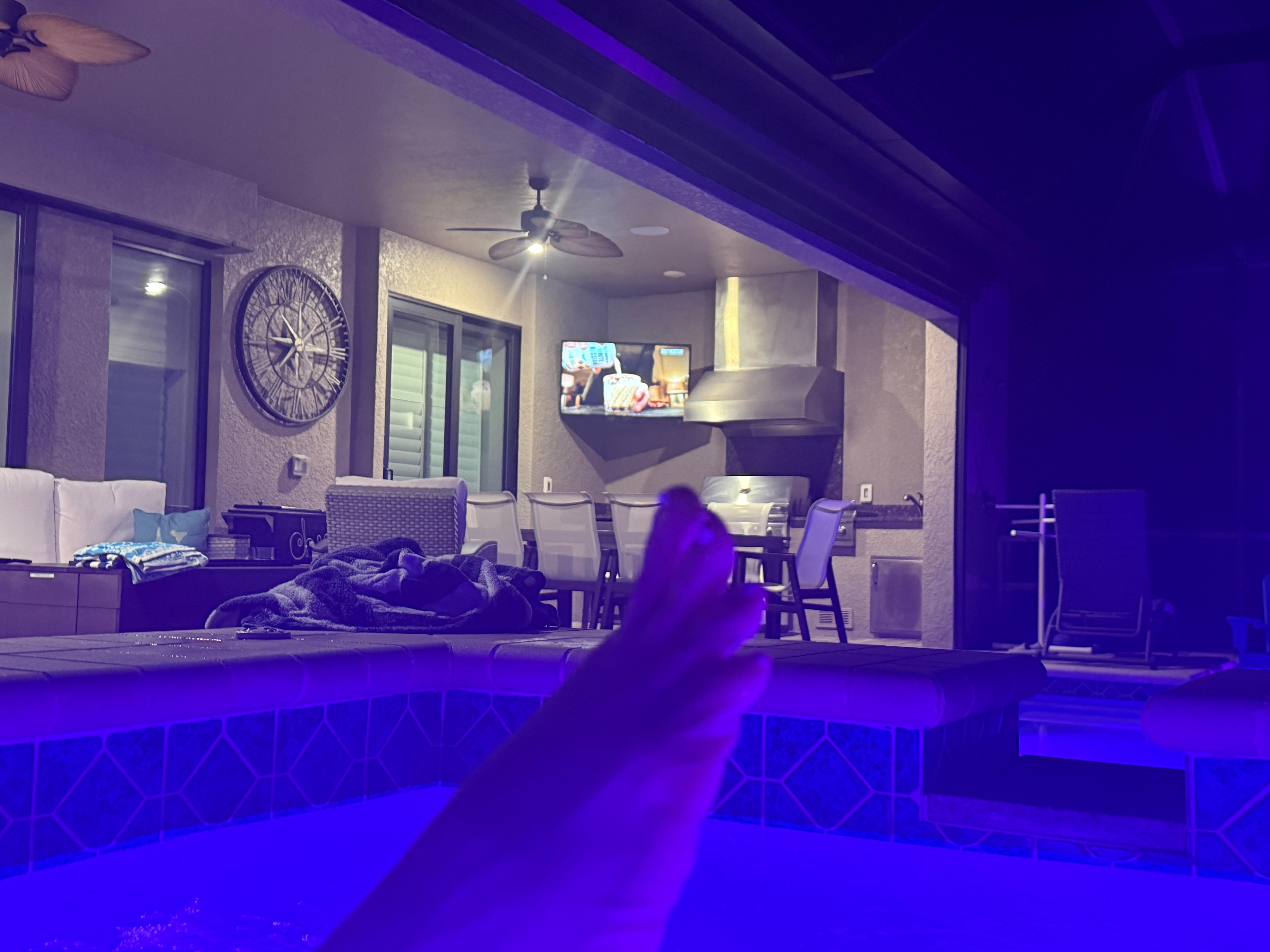 The enormous contemporary kitchen features barstool chairs along the island-style countertop and comes with all of the modern appliances and cookware that you need to serve an indoor family dinner or a seaside snack on the lanai. Of course, it comes with a margarita machine as well, which is ready for action when you’re craving a cool tropical beverage to enjoy in the hot tub.