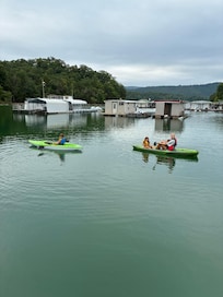 Lovin’ the Lake Life – Leave the crowds behind at this unique vacation stay. Living room with 55in TV. WIFI so you can stream your favorite movie, a 3 bd home surrounded by & FLOATING on water, yet firmly grounded & packed with every amenity to make your trip complete! Wake up to wide open views of the water from every window and start your day relaxing on the front deck enjoying your early morning coffee. Spend the afternoons exploring the coves and cozy inlets on our pontoon boat or bring your own & park it under our private covered boat slip. The kids will love the swimming platform and all the toys we provide – floats, life jackets, lily pad, water skis, boogie boards, everything you’ll need for a great and memorable family vacation. Wind down after a fun filled day with a cocktail on the private back deck as the crowds disappear and the water settles peacefully - you’ll have the quiet all to yourselves.