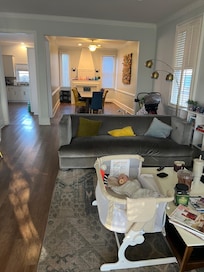 The house is arranged so that the entire first floor is gathering space and the entire second floor is sleeping space, and it makes it easy for guests to co-exist with different sleeping schedules. The spacious open concept living room has a large couch and additional comfortable seating and a smart TV. The colorful dining room has a long table and 8 chairs, and could seat 10.