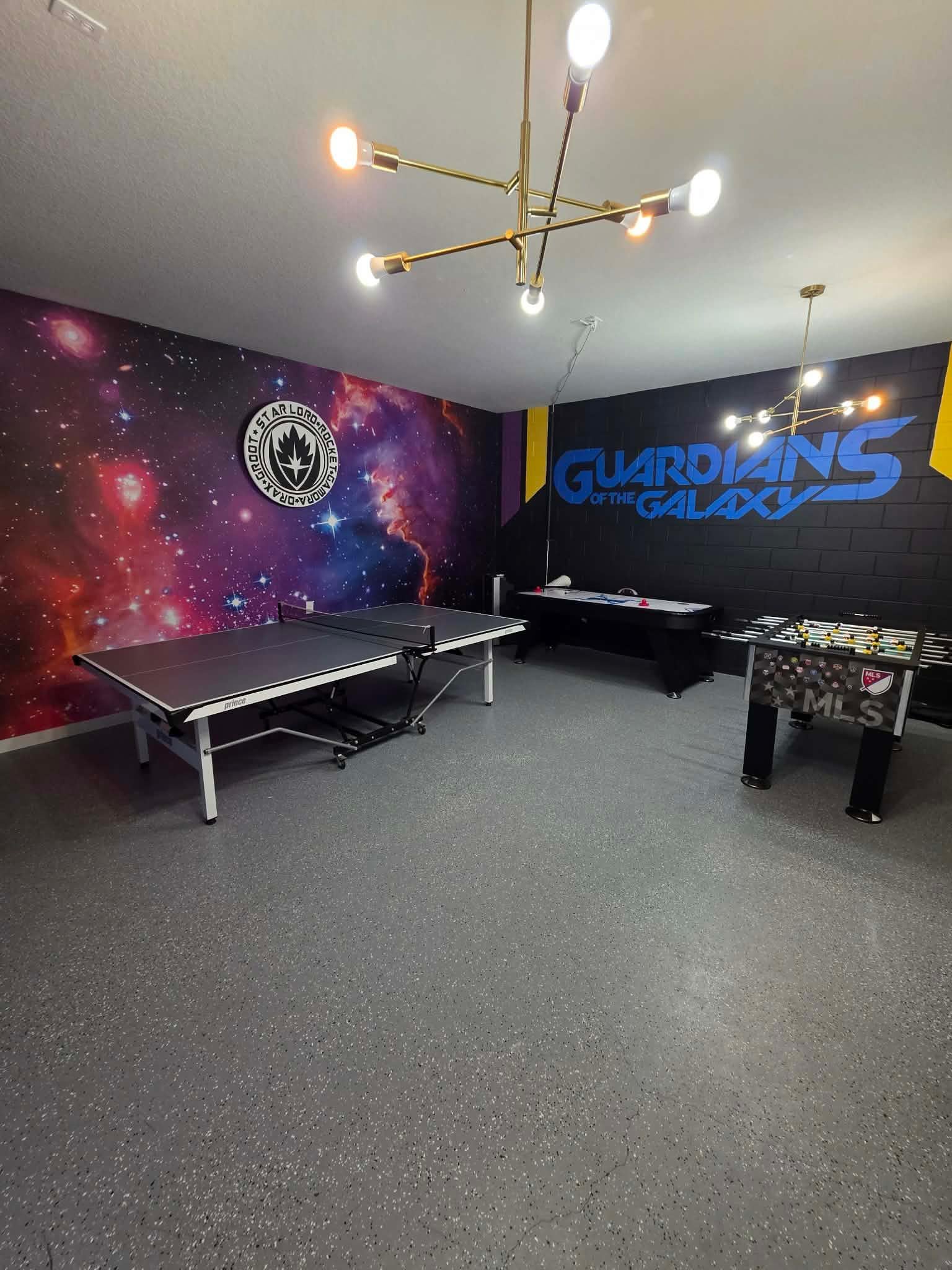 Fully converted game room with a Guardians of the Galaxy theme and AC for the ultimate fun experience.