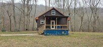 Each cabin is elevated up a few steps leading to a wood deck, up a few more steps leading to your front porch. (Our Riverside Blue cabin has a wheel chair ramp at the back porch). Your front porch & living room window overlook a variety of shade trees, fire-pit, grassy pasture, and a large weeping willow tree. Rockcastle River is across our grounds down an embankment. At night, pretty solar lights will automatically turn on, including string lights over the front deck, lanterns over cabin porches, tiki flame lights lining walkways and drive ways, and a few fun light designs in big trees around the property. A few camping chairs surround a fire pit out front along with a moveable charcoal BBQ grill. A rechargeable flashlight is provided for night time hang outs and walks.