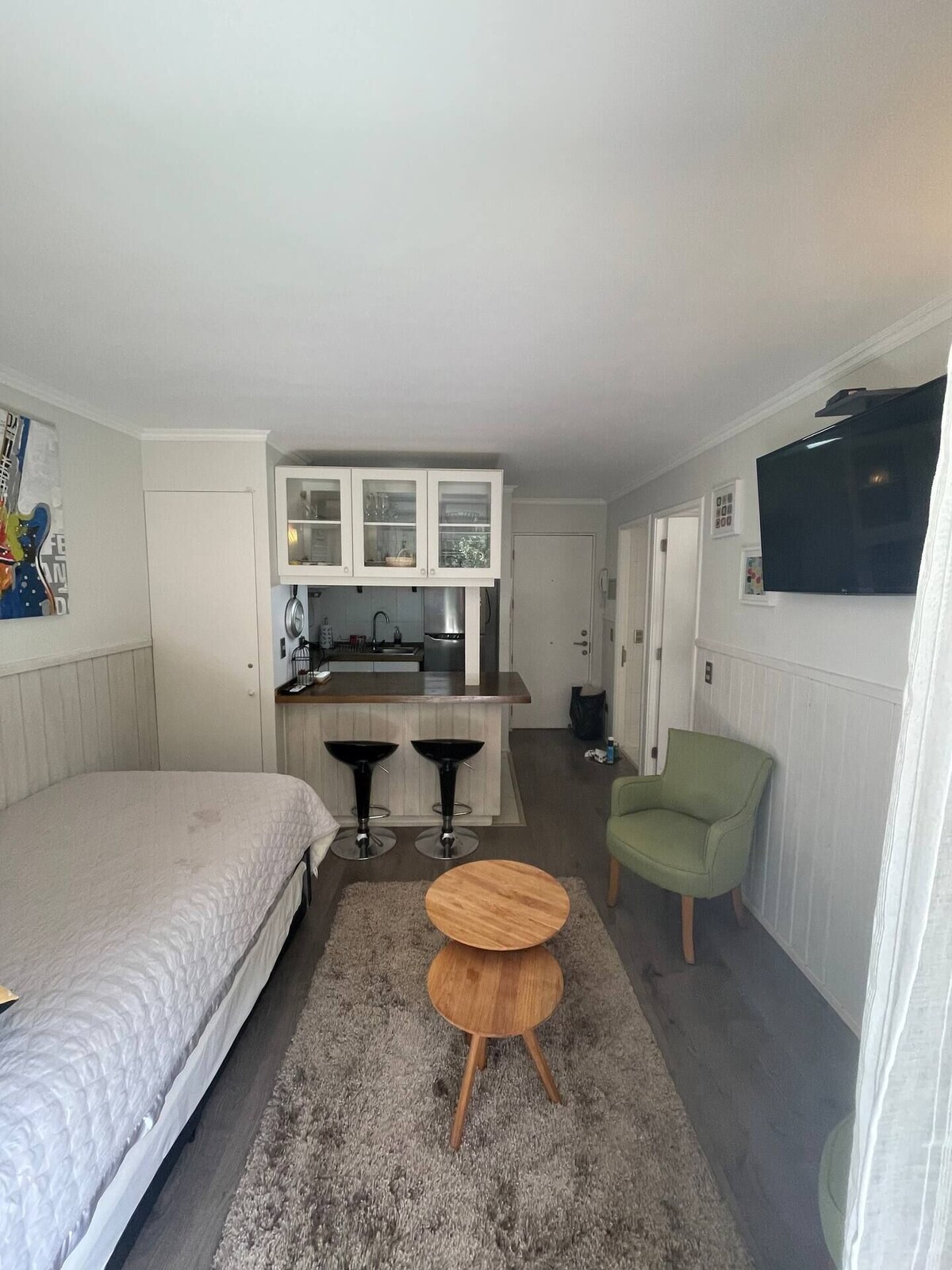 Cómodo, acogedor y luminoso departamento para hasta 4 personas. Ubicado a 5 minutos del centro de Pucón y a 25 minutos del centro de esquí,rodeado de hermosas Áreas verdes. Equipado para que disfrutes de una estadía como si estuvieses en tu casa; cuenta con 2 SmartTV,WiFi fibra óptica, una estufa eléctrica,ropa de cama de excelente calidad,secador de pelo, plancha de ropa,aspiradora ,licuadora, calientacamas de dos plazas,una hermosa terraza con una buena vista. (200 m de descenso Monasterio)