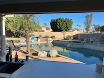 Entire home including garage is available for your next desert vacation! Five Bedrooms are as follows: the downstairs Master bedroom features a king bed, 42” Smart TV with Hulu ad free programming and 4k Netflix, en-suite bathroom with soak tub/shower/double vanity, and private exit way to the pool area. Bedroom #2 and #3 are downstairs each with queen beds and share Bathroom #2 which has a shower/tub combo. Bedrooms #4 and #5 are upstairs, have queen beds, and share Bathroom #3 with a shower/tub combo and a double-vanity sink .