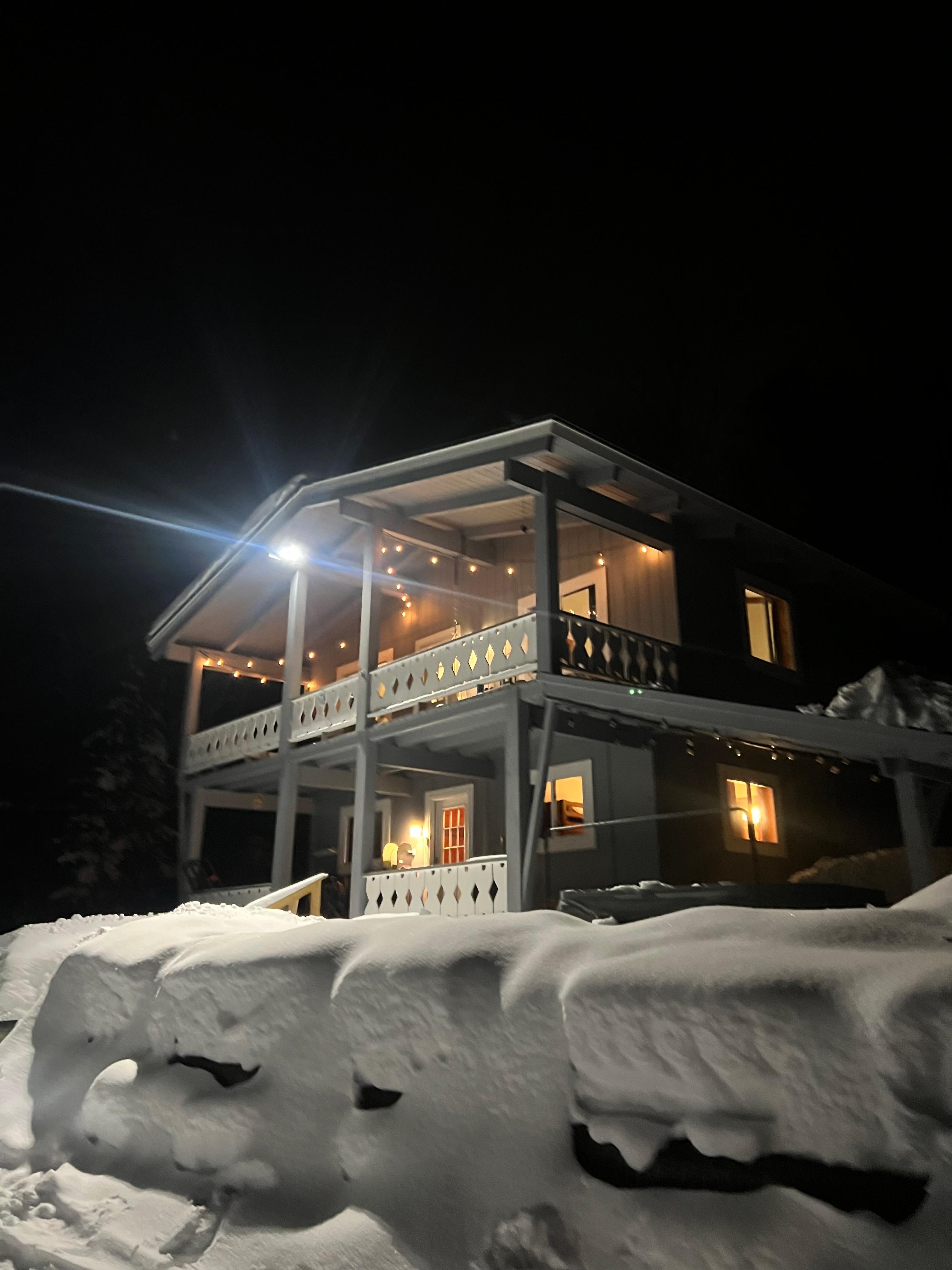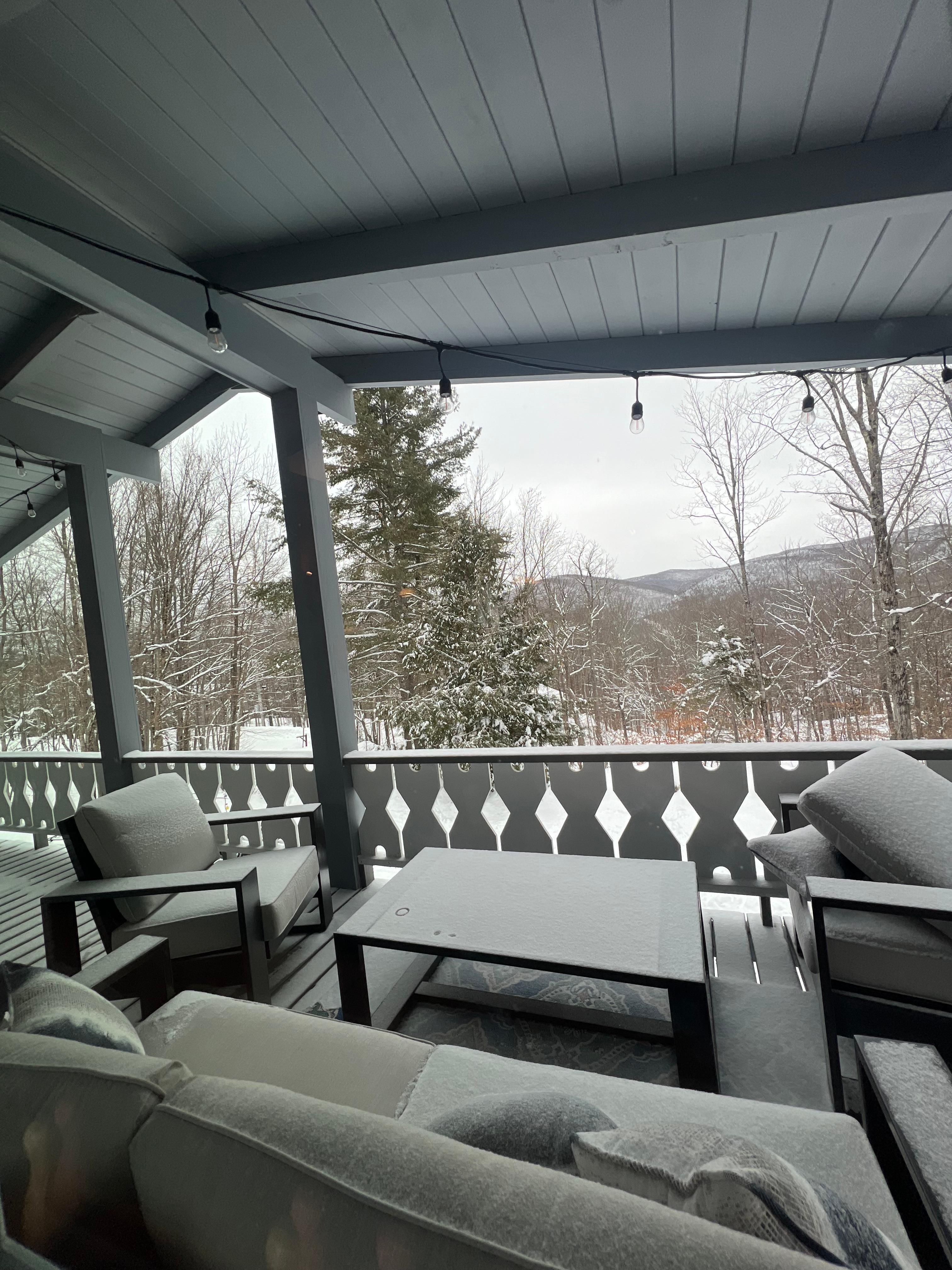 Covered porch with ski and snowboard holders. Step down onto the covered patio with hot tub.