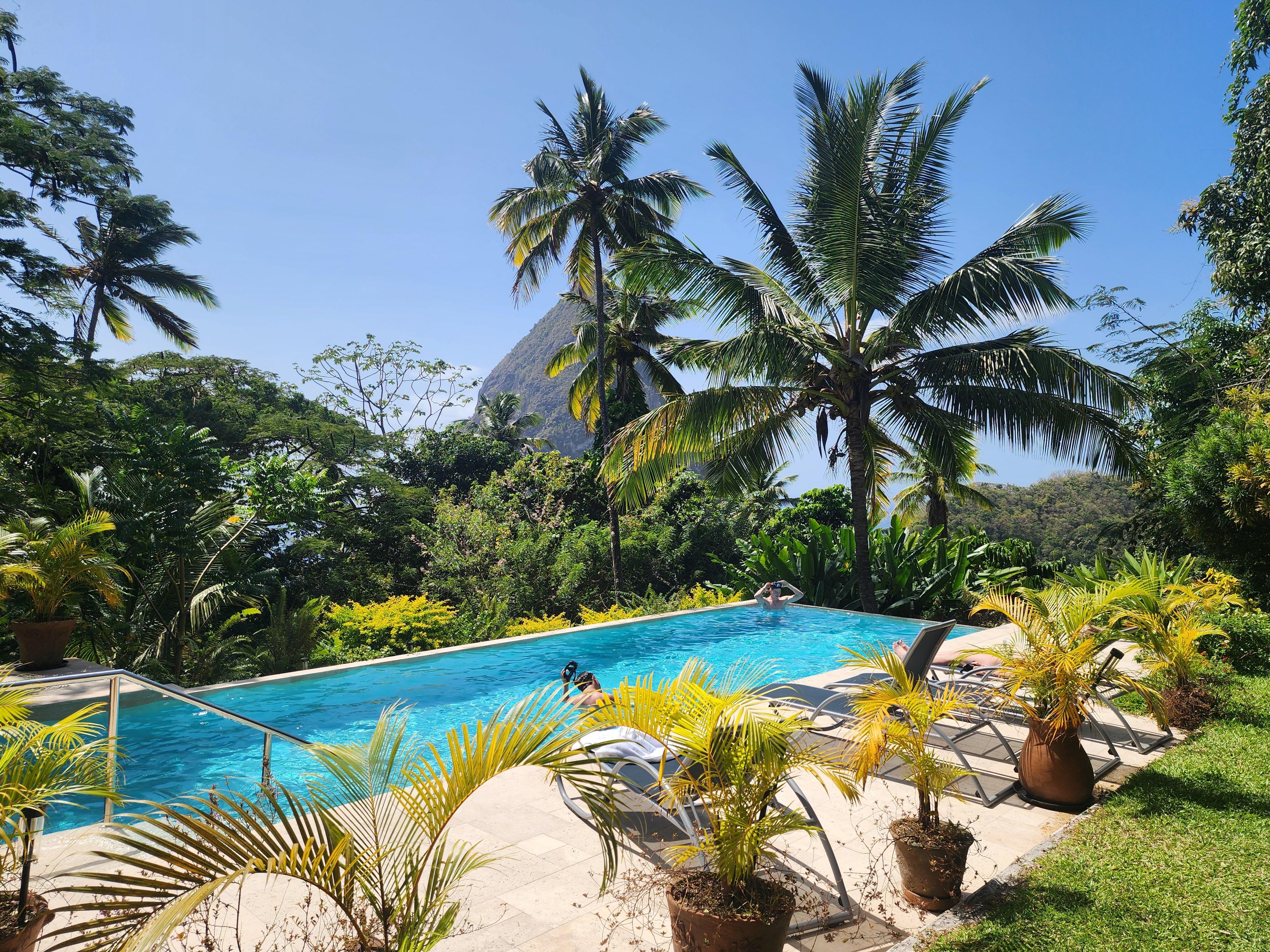 Our tropical estate enjoys a constant breeze blowing directly from the rainforest. The beautiful new 37 foot salt water infinity pool also provides great view of the Petit Piton.