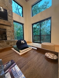 The great room encompasses the kitchen, dining, comfortable living space, large screen smart TV, wood burning fireplace, a “chill “reading nook with picturesque windows and balconies maximizing views from all sides of the house.