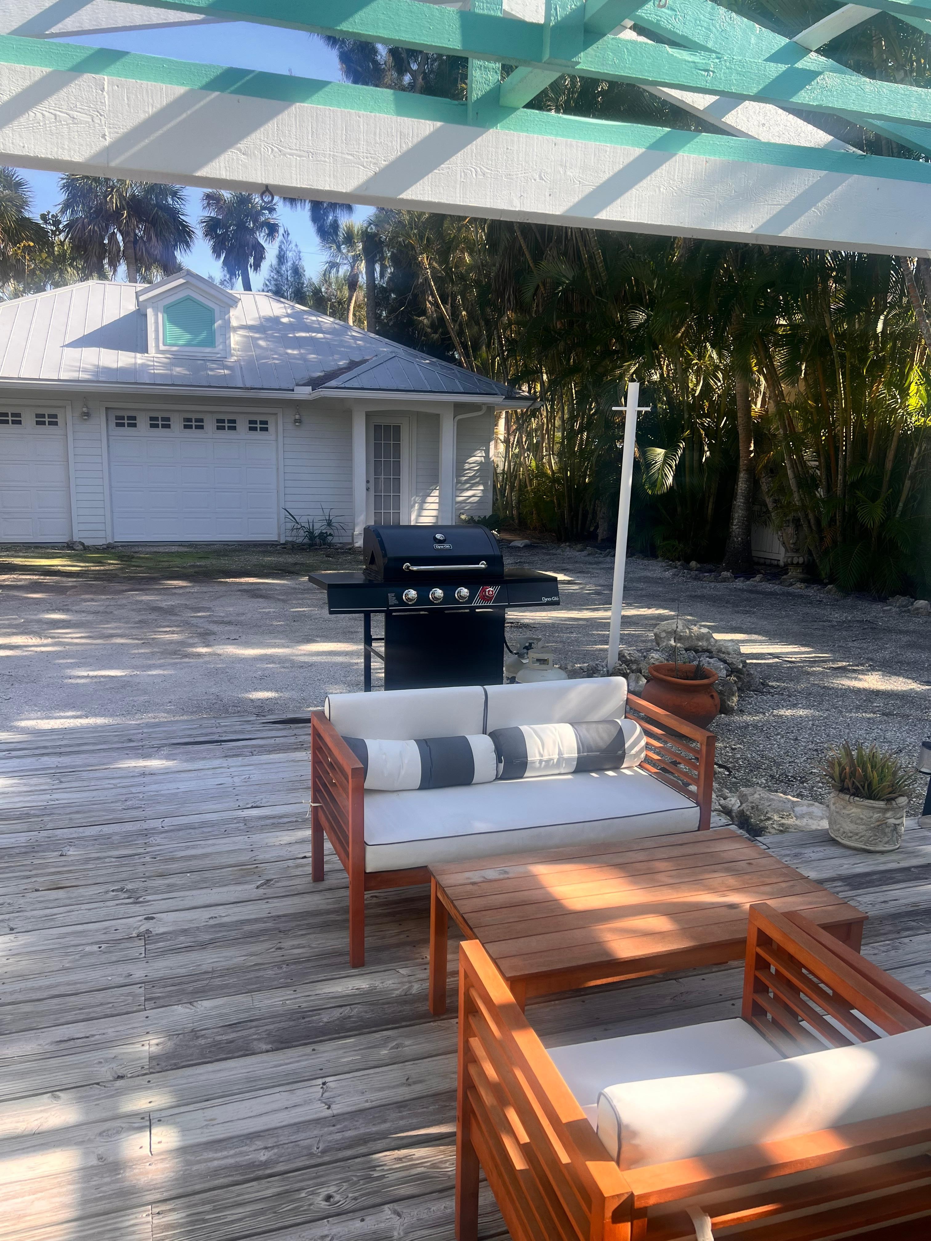 Relax in your private backyard oasis, surrounded by tropical palms. The covered porch offers a shady retreat with Adirondack chairs and an outdoor dining table, perfect for enjoying casual meals after a day at the beach. Fire up the BBQ grill for an island cookout or simply unwind with a cool cocktail.