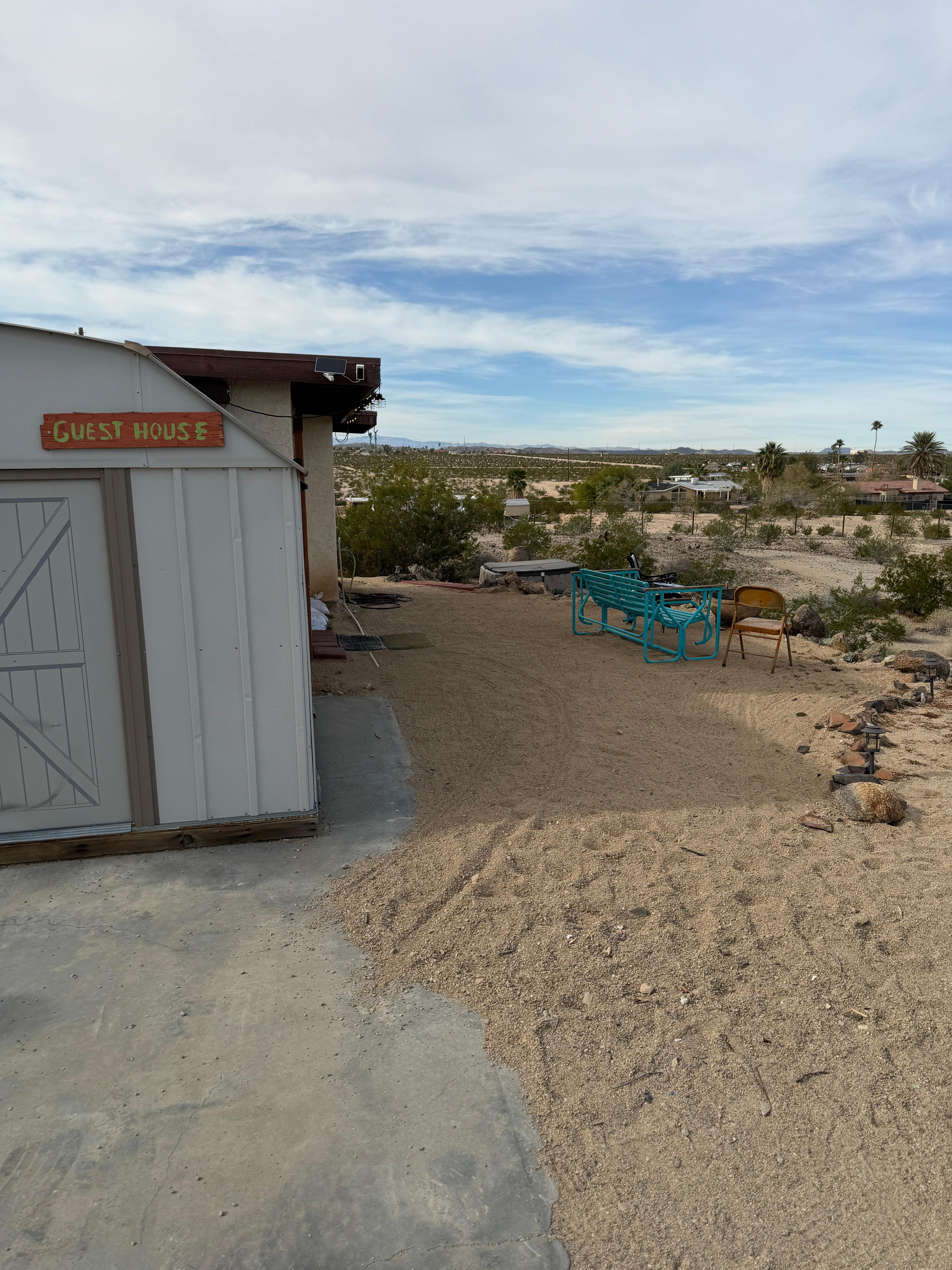 At the top of the hill, past giant saguaros, open the gate and drive up to a small cabin on five boulder-strewn fascinating acres on one of the highest points in the city of Twentynine Palms, with huge views to the north, west, and east. Bask in the private hot tub or just sit at the private fire pit and enjoy the stars, take the mile-long trail through the property, or check out the wildlife at the pond. Inside, unwind in a cozy studio (320 sq ft), with a really comfortable queen bed, linen sheets, and the amenities you want: smart TV you can watch from bed, complete kitchenette with drip coffee maker (coffee and decaf supplied), and a full bath. Ten-minute drive to the park entrance, and three minutes to groceries. It's perfect for a shorter visit of up to a week, or if you're on a road trip passing through. At night, the stars are spectacular. This is our house, and we're local, so if you need anything -- advice, help, etc. -- we're here to help.