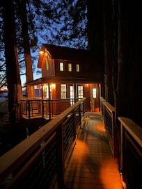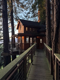 Welcome to Pacific View Treehouse, a hidden gem nestled within the redwood trees on a private, gated property. This unique retreat is accessible via a walking path that leads from the parking area, immersing guests in the natural beauty of the surroundings. As you stroll along the path, you're greeted with stunning mountain views and glimpses of the ocean in the distance, setting the stage for a tranquil and picturesque stay.