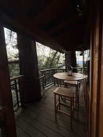 What truly sets this treehouse apart is the private, detached full bathroom, ensuring comfort and convenience. Additionally, a wraparound deck encircles the treehouse, providing a 360-degree view of the breathtaking landscape. From here, guests can enjoy the serene mountain vistas and the calming sight of the ocean, all while being enveloped by the towering redwoods.