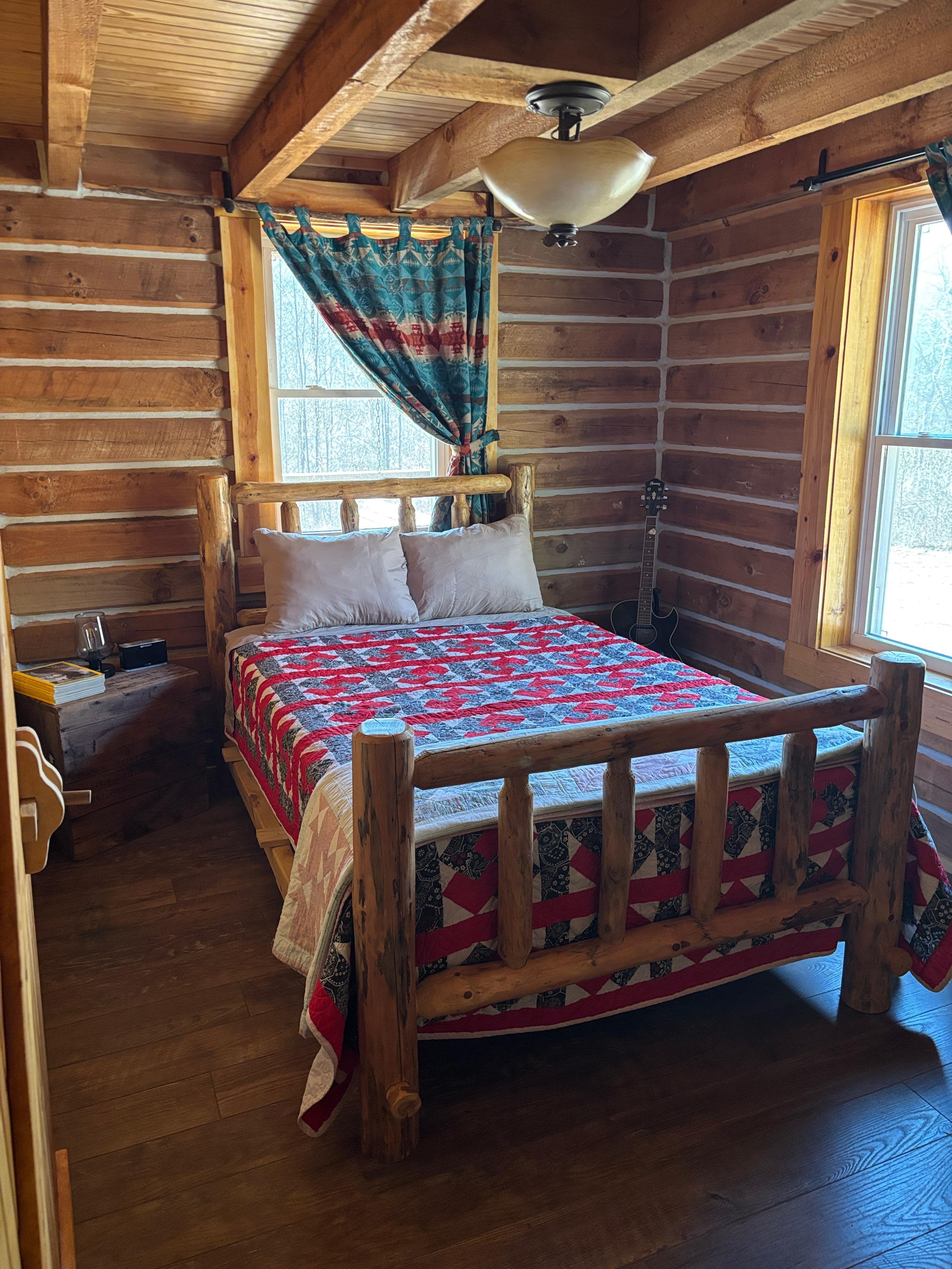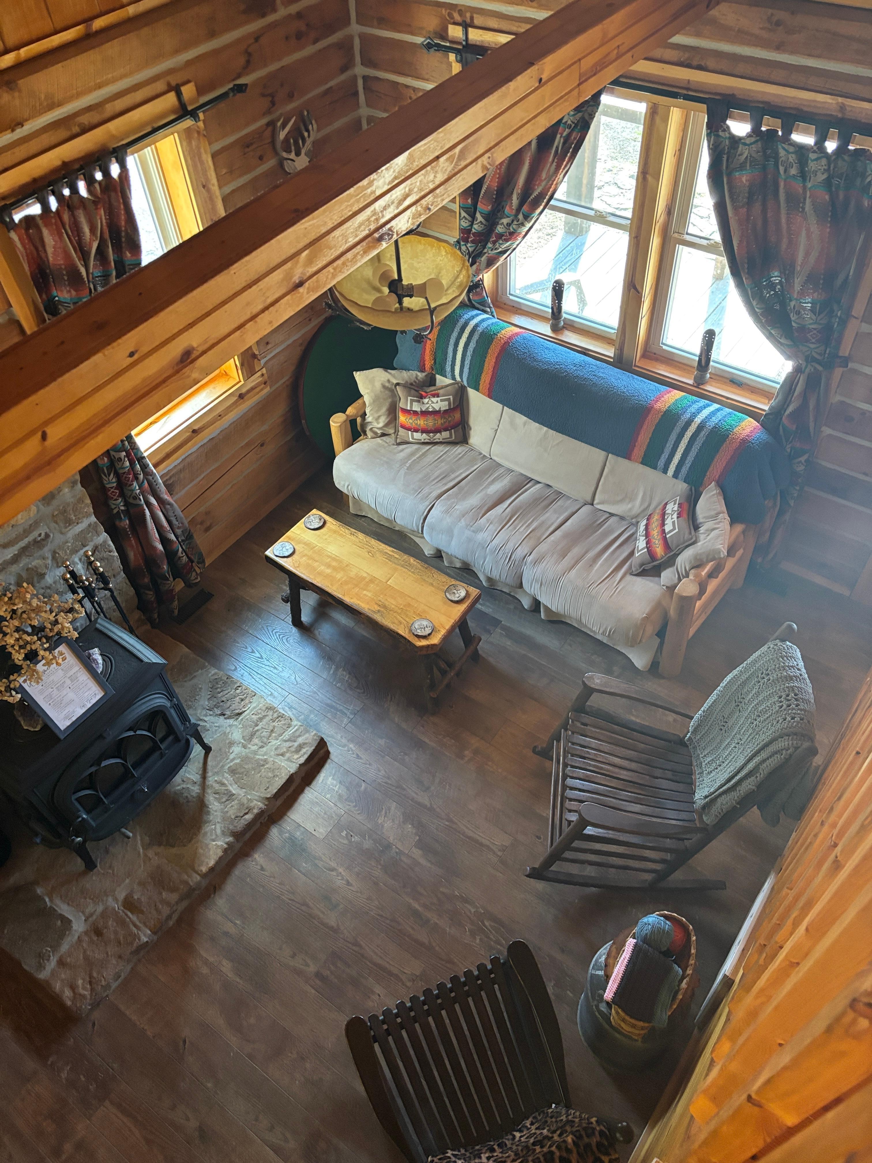 Our 2 bedroom with loft cabin has all the comforts of home and can sleep up to 6. The loft bedroom with queen bed opens to the living room below. Another bedroom on the main level provides a full bed and additional sleeping space can be accommodated with the queen sized futon in the livingroom.