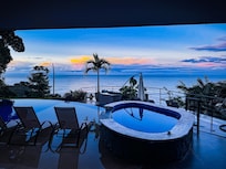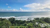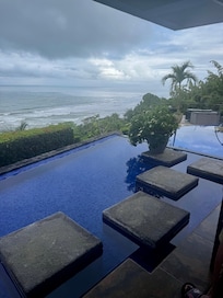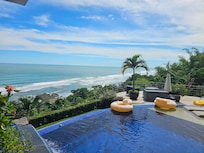 Encaramado directamente sobre Dominical Beach, pero a solo 100 metros de un nuevo camino pavimentado lejos del océano, esta villa contemporánea tropical de nueva construcción no tiene igual. Increíbles puestas de sol durante todo el año, esta es fácilmente la mejor vista al mar en el Pacífico Sur de Costa Rica con la misma vista espectacular desde casi todas las partes de la casa. Observe a las personas que están abajo caminando en la playa y surfeando mientras está acostado en su cama y durmiendo con el sonido del oleaje en la playa en la cala rocosa escondida justo debajo de la casa. La villa está exquisitamente amueblada con maderas raras y encimeras de granito, mármol y cuarzo. La villa tiene capacidad para 14, con 5 dormitorios y 4. 5 baños, villa de tres pisos, gimnasio privado y bar en el mirador del tercer piso, 4 bares, mesa de billar, futbolín, gran piscina con azulejos nuevos, 2 cascadas y 6 asientos. bar en la piscina, gran jacuzzi al aire libre, parrilla de gas de primera línea, cocina gourmet con electrodomésticos de primera línea, gran terraza en el patio al aire libre "bajo techo", sala de estar interior súper cómoda, garaje para 3 autos con portón eléctrico, hermosos jardines y jardines , todo a pocos pasos de la playa!
