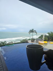 Una suite principal con salón privado y bar, cama king size con colchón de espuma viscoelástica y cuentas de enfriamiento. Enorme baño con lavamanos para él y para ella, ducha grande y bañera de burbujas con jacuzzi en cascada con espectaculares vistas al océano y al atardecer.