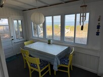 This cottage with a fully-glassed in porch overlooking the Delaware Bay makes you feel as if you are outdoors year-round. The open floor plan affords a view of the water from the back door, through the kitchen and living room, to the front porch.