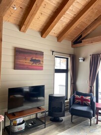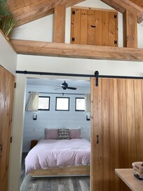 "The Maple Moose" was designed and built to be a luxury, modern version of the old sugar shacks of Vermont. On entering the house through the porch you will be in the living space with vaulted wood ceiling and rough hewn hemlock posts. There is smart TV for streaming your favorite Netflix or Prime shows (no cable) and a Bose stereo sound system. If you'd rather make your own music, we include a rather nice acoustic guitar. The large sliders open on to a well-proportioned deck with outdoor dining and casual chairs for enjoying morning coffee. The kitchen features luxury stainless appliances as well as a Nespresso coffee maker, island and dining table. Through the large wooden barn door is the bedroom with en-suite bathroom. There is ample closet and storage space. The bathroom has a glass door shower and water-sense rain shower.