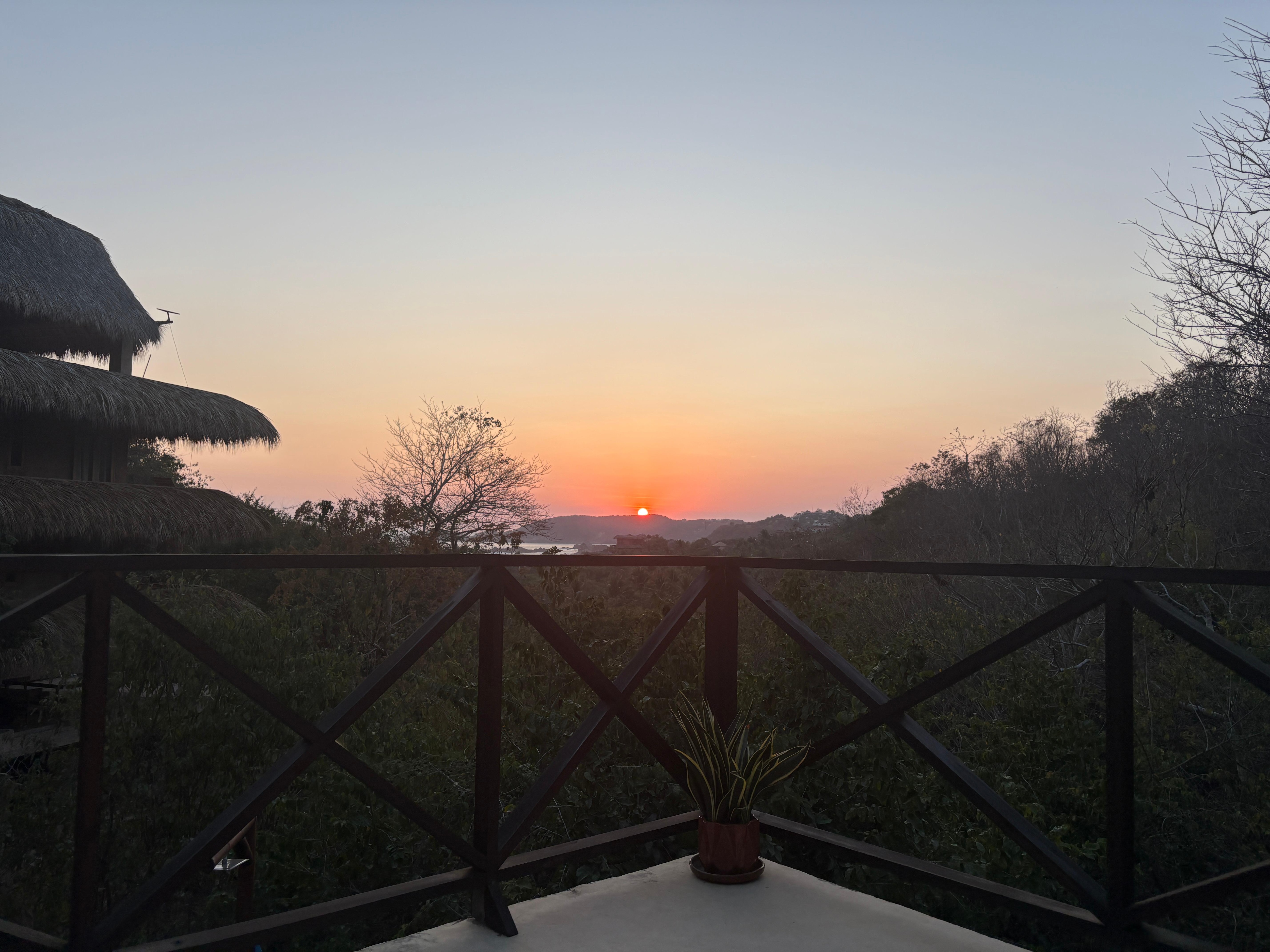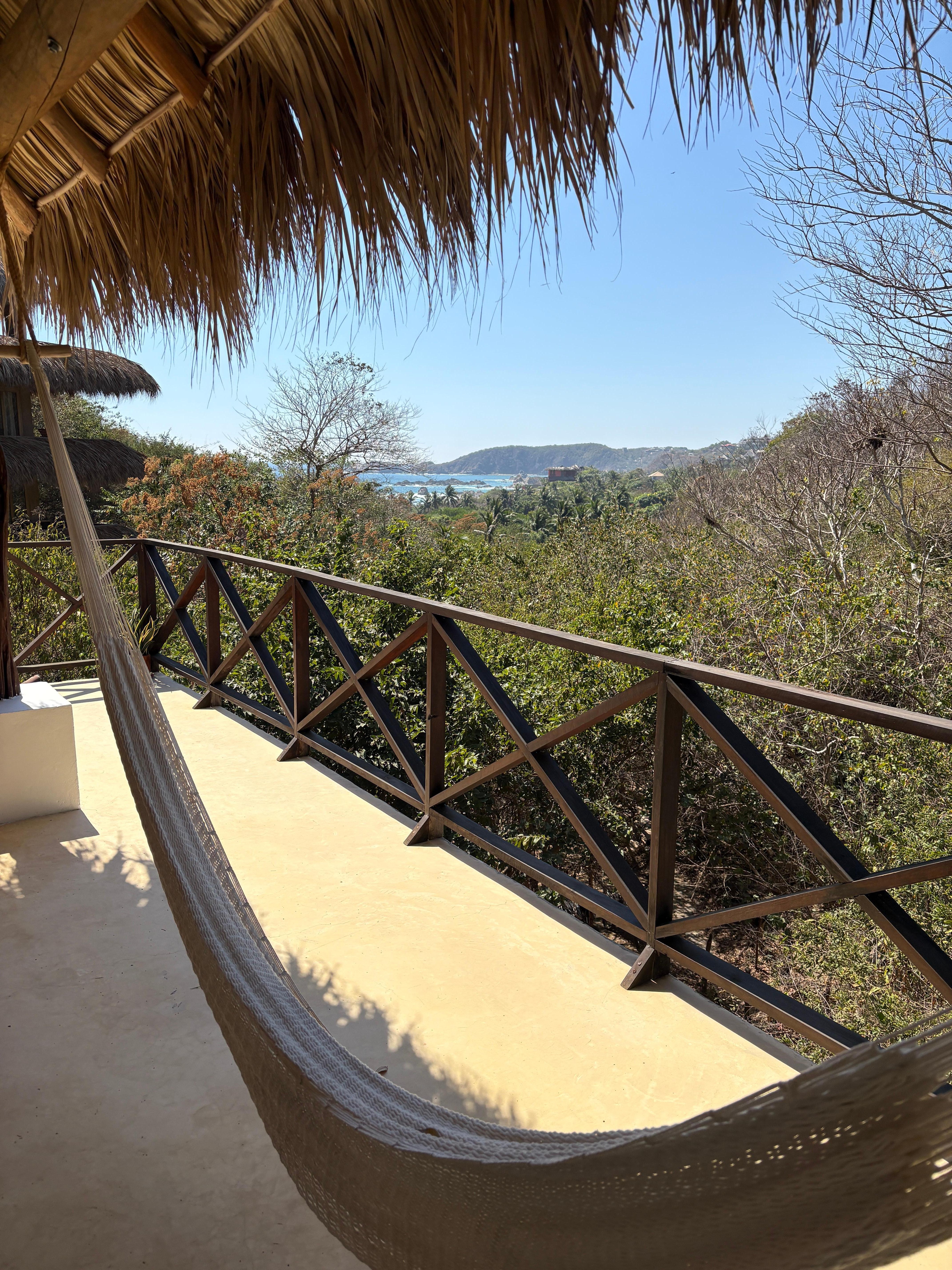 Las habitaciones cuentan con un escritorio y una silla para poder trabajar a gusto con el mejor Wifi de la zona Starlink (satelital, bastante rápido). Las habitaciones están hechas con materiales locales de la mejor calidad: camas queen size hechas de madera de parota, tal como el closet y los muebles del cuarto de baño. Tenemos en una hermosa palapa artesanal que da a la casa un toque muy especial. Las cortinas son semi blackout para tu comodidad.