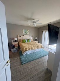 In the second bedroom, a king-sized bed awaits, offering luxurious comfort for two lucky guests. Complete with a flat-screen TV featuring Roku. Meanwhile, the third bedroom offers versatile sleeping arrangements, with a queen bed and a set of bunk beds accommodating up to four guests in total. Complete with a flat-screen TV featuring Roku, this room ensures both relaxation and entertainment for its occupants