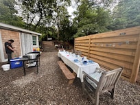 Our Cockle Cottage Guest House takes full advantage of the single floor of living space, with a queen bed in the master bedroom, and the second bedroom has a twin bed and twin trundle underneath. The living room has a futon couch and mounted TV to unwind. There is a full fridge, sink, and stovetop in the guest house as well as a full shower in the bathroom. Follow the deck off the front of the guest house back to another private outdoor shower and entertainment area with new privacy fence and stone fire pit!