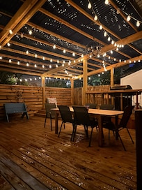 A few steps from local restaurants, a huge covered deck, and blocks from the sand.