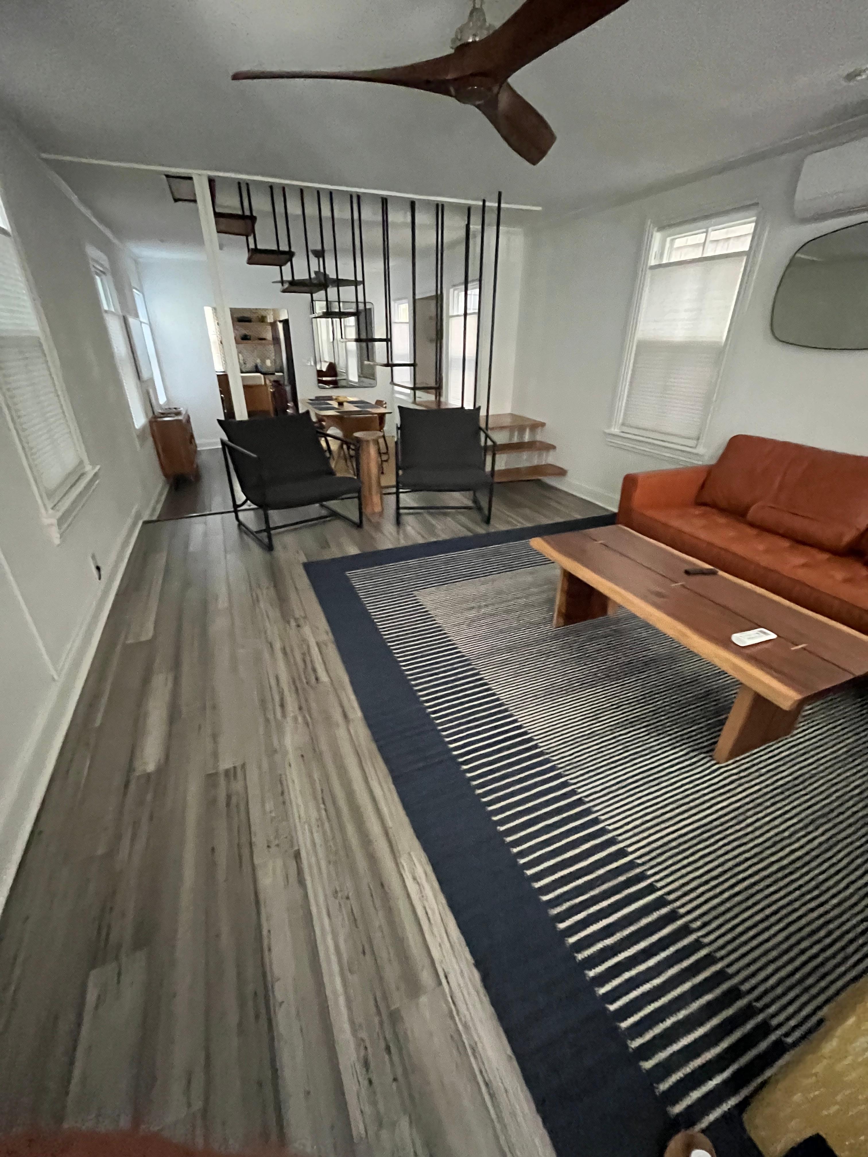 The living room serves as a hub for relaxation and entertainment, with a striking floating staircase, a Samsung TV, Bluetooth speaker, and high-speed internet. Comfortable seating makes this the perfect spot to unwind.
