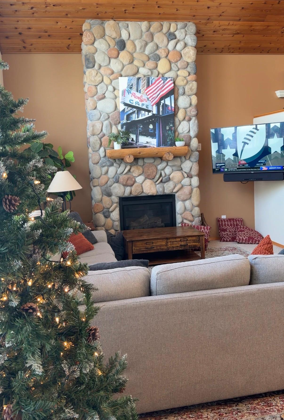 Dormitorios: si necesita su espacio, hay un montón de espacio en los tres dormitorios: la suite principal con vigas expuestas cuenta con una cama trineo tamaño king ubicada en el segundo piso. En la planta principal, hay una habitación con una cama doble en un marco de madera de estilo artesano y una habitación familiar con una cama doble y una litera de madera adyacente.