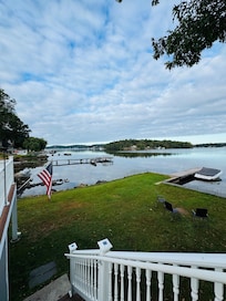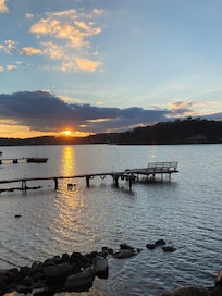 Este encantador frente al lago está a pasos del nivel del césped del lago. Esta casa de dos dormitorios y dos baños duerme 4 en privado o seis semiprivada. Primera planta ofrece un concepto abierto salón / comedor tranquilo con vistas al lago expansivas y chimenea de gas para las tardes acogedoras. Una cocina bien equipada ofrece todo lo necesario para el cocinero, incluyendo una estufa de gas y lavavajillas. Dormitorio del primer piso tiene una cama de tamaño completo y sala de estar incluye un sofá de tamaño completo a cabo. Dormitorio del segundo piso también contiene una cama de tamaño completo, así como un sofá cama de tamaño completo y un generoso baño en suite. Una gran terraza con asientos al aire libre para cenar. Las comodidades incluyen aire central, lavadora / secadora, múltiples HDTV, WiFi, fax / copia, conexión inalámbrica a Internet óptima y cable.