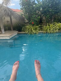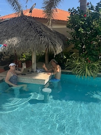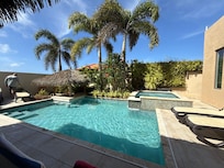 Step into your own personal paradise beginning with the 18 foot soaring great room and a dining table that seats 10. Glass doors open into your own personal paradise. Her pool glitters day and night under the Aruban sun and LED color light shows. She’s surrounded by tropical plants including a hydroponic garden wall and amazing sunsets. Jetted jacuzzi is attached to the pool. Jacuzzi is NOT heated.