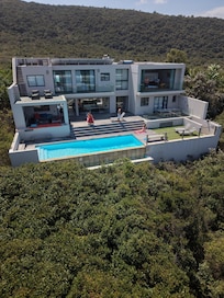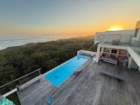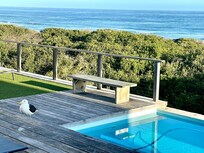 Home By The Sea is the perfect place to relax and leave the world behind and to explore the beautiful garden route. The house has the modern luxuries required to make your valuable holiday enjoyable. The views are simply breathtaking and there is a sense of privacy and feeling close to nature. The beach is reached via a private walkway and you can walk for hours or just sit on the dunes and watch the dolphins all year long and the whales in season. The rim flow pool is solar heated and lovely and warm in the summer and you can enjoy sundowners on the roof with a panoramic view of the entire Plettenberg Bay.