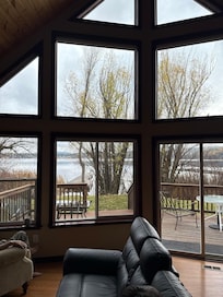 Esta casa de dos dormitorios y dos baños cuenta con encimeras de granito y gabinetes de cerezo en arce. Sofá de cuero, buen sillón reclinable y una mesa de ajedrez de tamaño completo. Tiene una hermosa chimenea con un gran televisor de pantalla plana por encima de la chimenea en la pared. Ropa de cama fresca, lavadora, secadora, toallas, microondas, cafetera, Wi-Fi y Direct TV. Esta es una casa de marco A con grandes ventanales que ofrecen una hermosa vista del lago y las montañas circundantes.