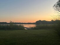 Inside, you'll find central heating and air conditioning for year-round comfort, along with eco-friendly no-VOC vinyl flooring in the kitchen and bathroom and soft carpeting throughout the living areas and bedrooms. The sleeping arrangements include a Queen bed in one bedroom and a bunk bed in the other, consisting of a Queen bed on the bottom and a twin on top. The bathroom features a comfortable shower, hairdryer, and towels, shampoo, and body wash, adding convenience to your stay. Enjoy cooking in the fully equipped kitchen, and dine in the cozy dining area or on the lakefront porch. There are also picnic tables overlooking the water—perfect for outdoor meals.