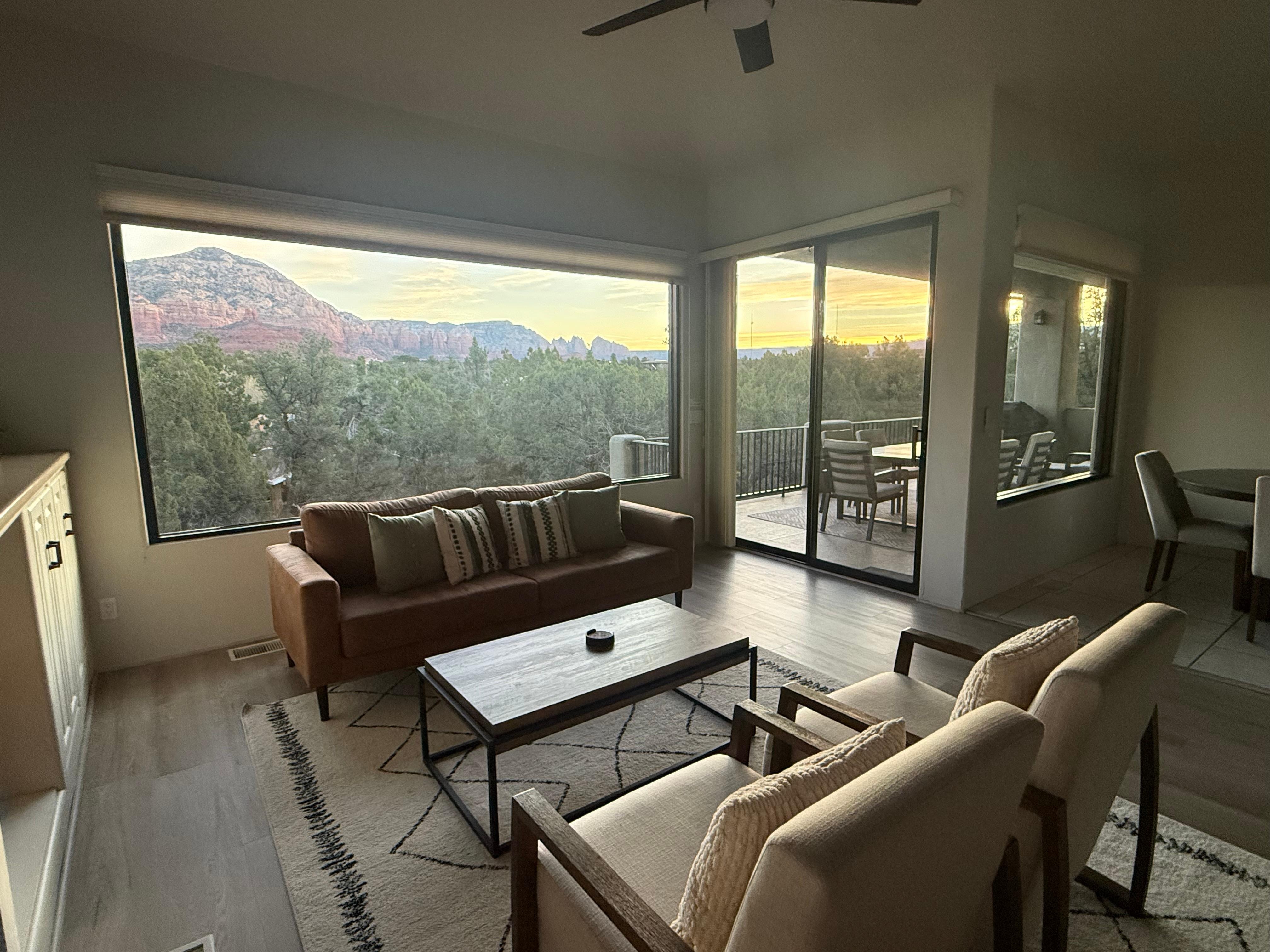 Living Room: The open layout creates a warm and inviting atmosphere, filled with natural light. With plush furnishings, a cozy gas fireplace, and a 65” Smart TV, the living room is perfect for relaxation. Expansive windows with reflective glass provide panoramic views of Sedona's red rocks, making every seat ideal for sunsets and stargazing. The living room flows seamlessly into the kitchen and breakfast nook.