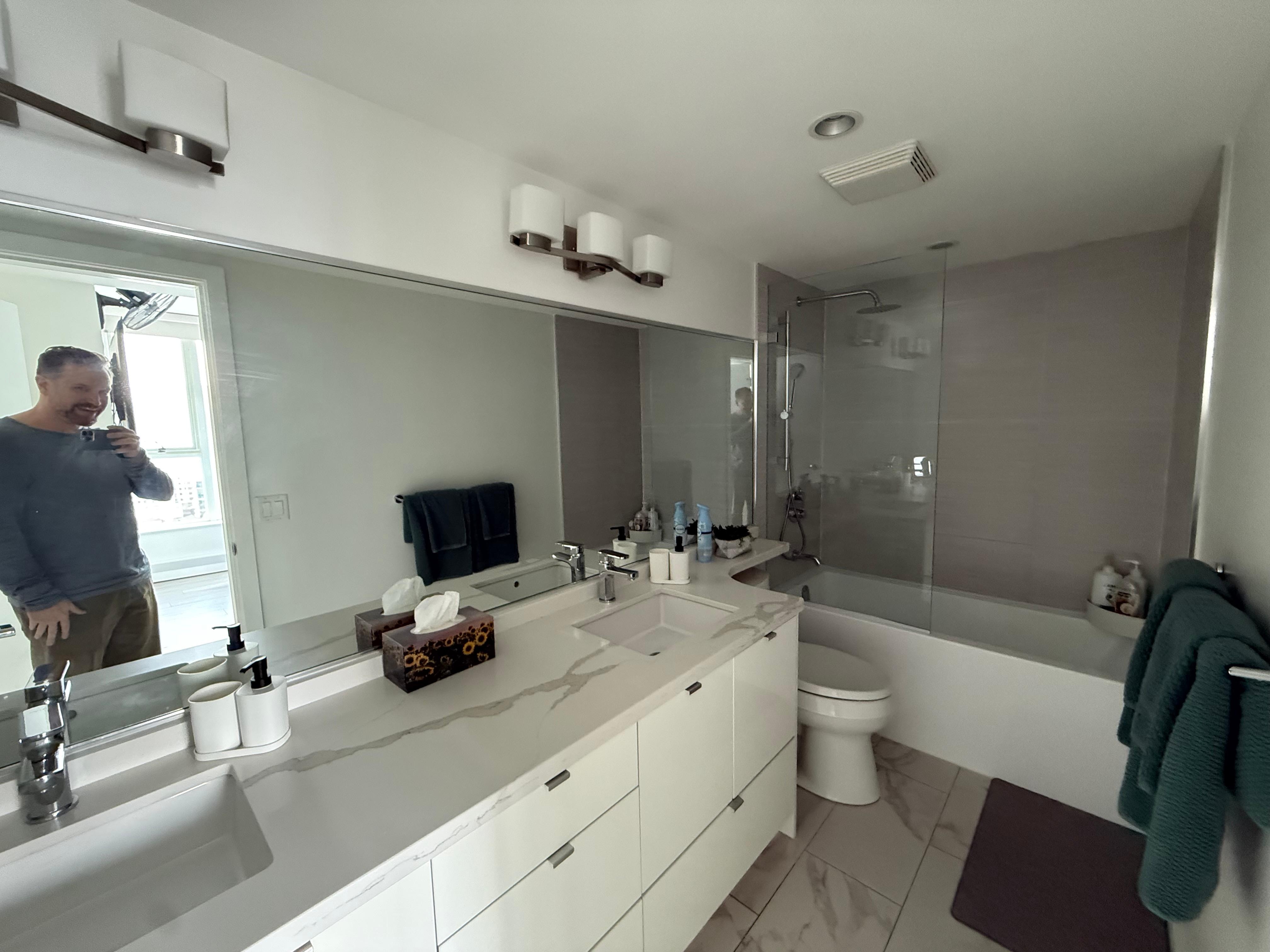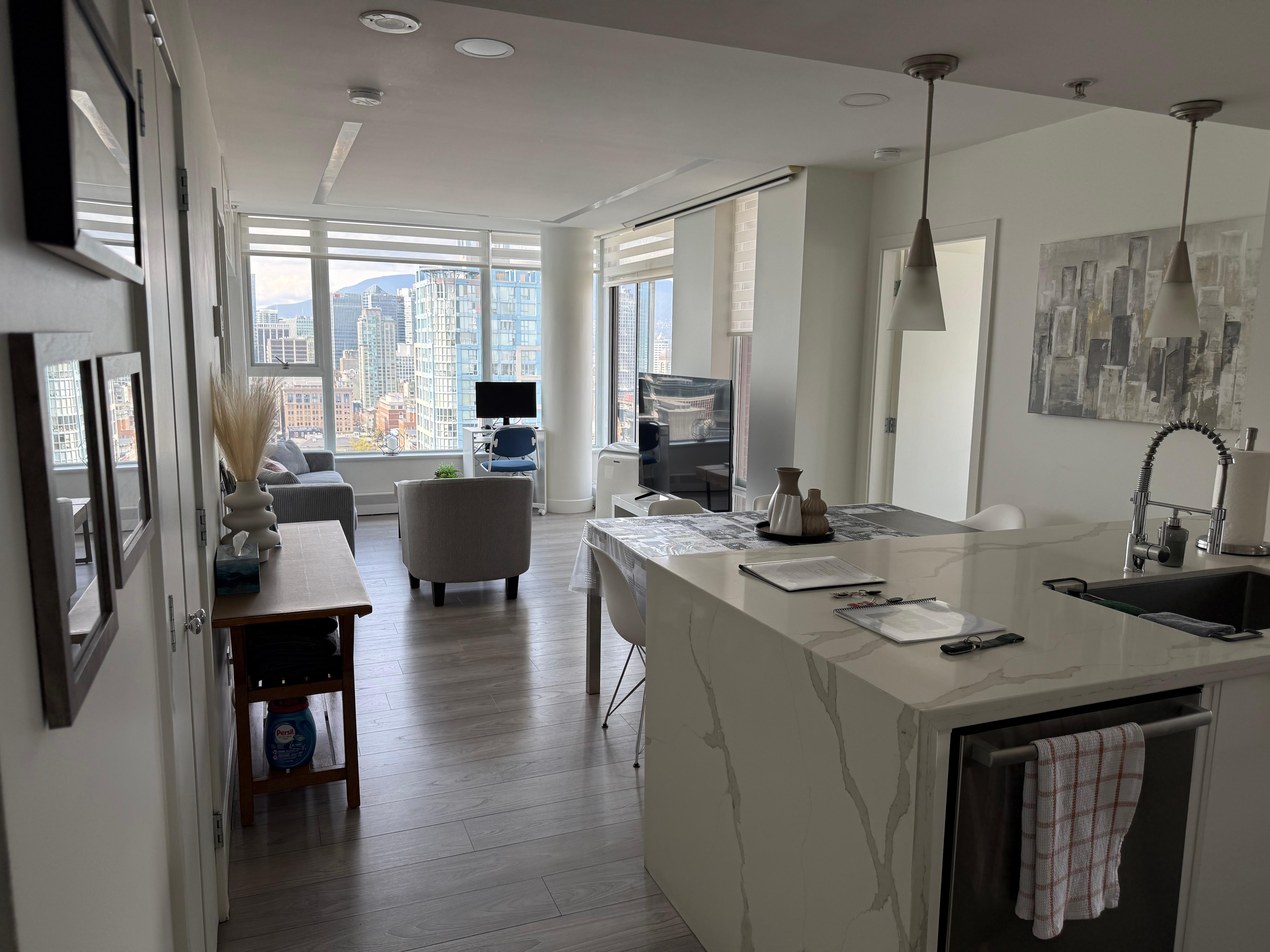 Great views from the 35th floor, looking NW towards downtown and the water. The location was ideal, near BC place and Rogers. Grocery options were really good with T&T and Costco close by. We enjoyed watching the mountains change with the light during sunrise and sunset. The pool area was bright and great for kids with consistent 3.5' pool depth. The condo was bright with enough room for 4 adults and 2 children.