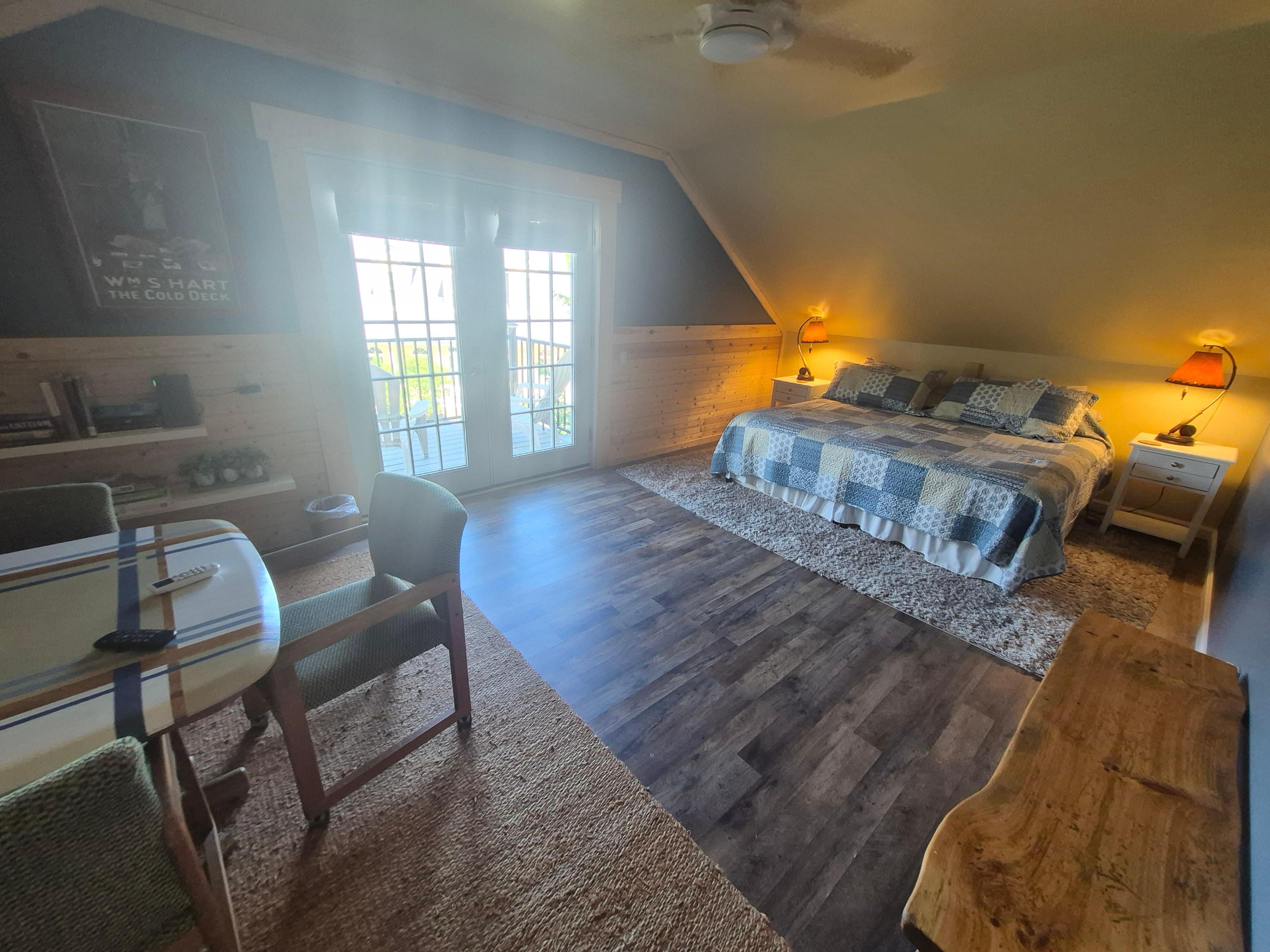 A boat dock to offer guests with a nearby launch spot. The accommodations are brand new, in a barn with the rest of the barn a game area. 65 steps to waters edge for kayaks and paddle boards. Swimming off the dock. We live in the main house and are available 24/7!