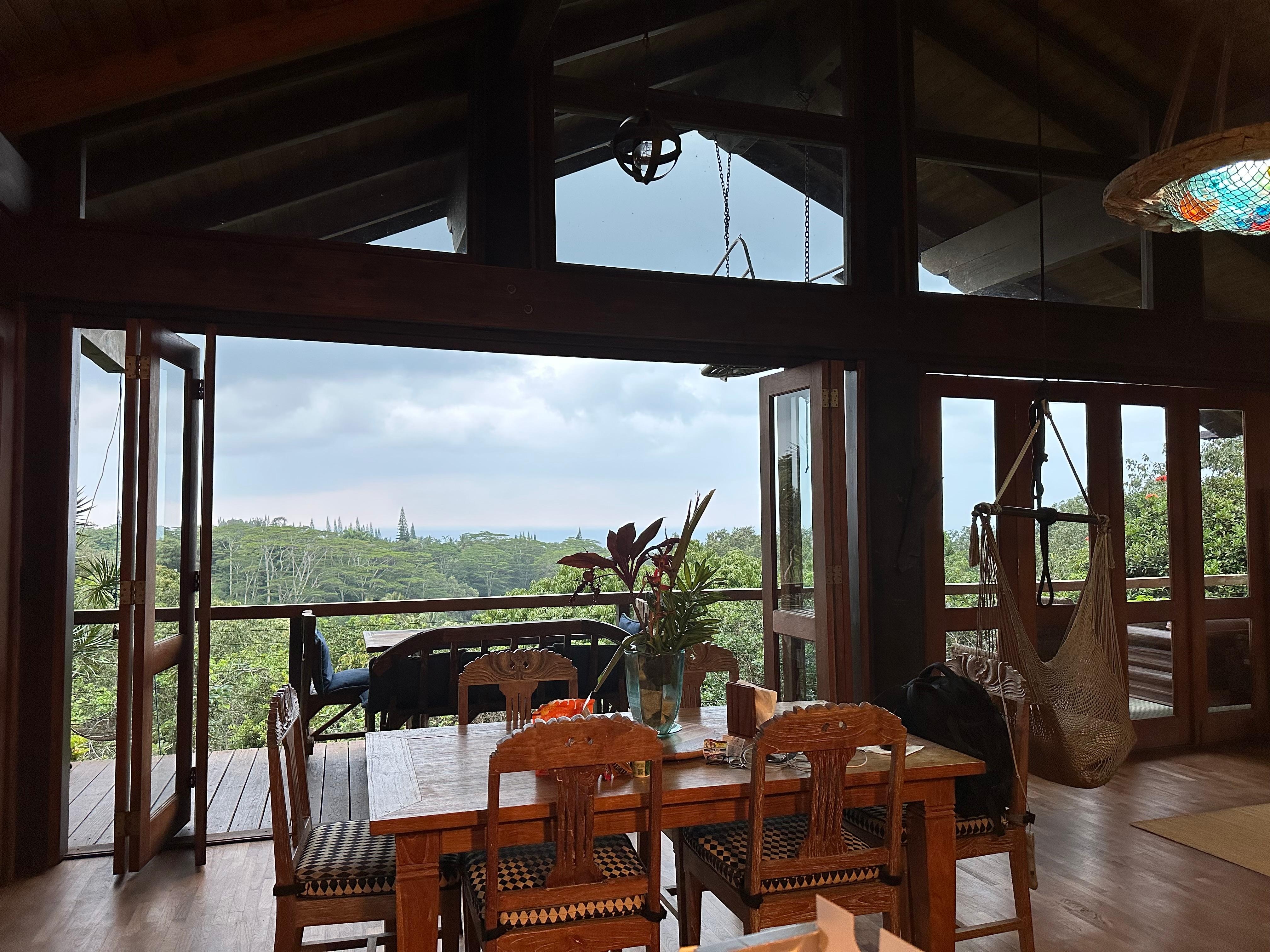 Magníficas vistas panorámicas al océano y a la montaña desde el segundo piso: ofrecen 1000 pies cuadrados de espacio habitable más un desván privado y 700 más en la cubierta cubierta [nivel inferior reservado para la administración: oficina, lavandería y suministros, deshidratación de banano; esta es una zona tranquila cuando los huéspedes están presentes]. El interior fresco y acogedor es tan acogedor y confortable que algunos de nuestros huéspedes se saltaron sus tours para quedarse en casa y experimentar la soledad, la privacidad y las vistas infinitas. Los huéspedes a menudo se sorprenden al llegar cuando pueden salir a la terraza y contemplar el océano desde los cuatro rincones de la casa.